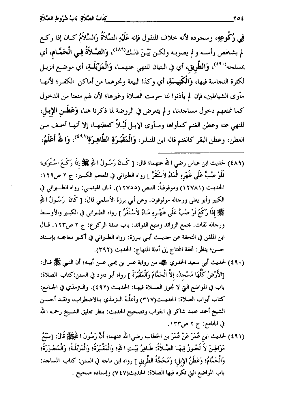 (¬491) لحديث ابنِ عُمَرَ عَنْ عُمَرَ بن الخطاب رضي الله عنهما؛ أَنَّ رَسُولَ اللهِ - صلى الله عليه وسلم - قَالَ: [سَبْعُ مَوَاطِنَ لاَ تَجُوزُ فِيهَا الصَّلاَةُ: ظَاهِرُ بَيْتِ اللهِ؛ وَالْمَقْبَرَةُ؛ وَالْمَزْبَلَةُ؛ وَالْمَحْزَرَةُ؛