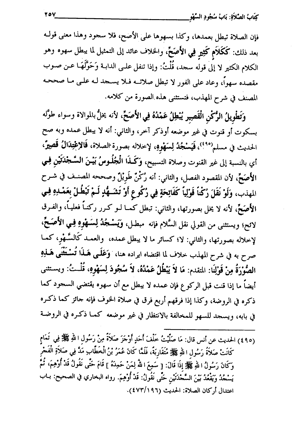 (¬495) الحديث عن أنس قال: مَا صَلَّيْتُ خَلْفَ أَحَدٍ أَوْجَزَ صَلاَةً مِنْ رَسُولِ اللهِ - صلى الله عليه وسلم - فِي تَمَامٍ كَانَتْ صَلاَةُ رَسُولِ اللهِ - صلى الله عليه وسلم - مُتَقَارِبَةً، فَلَمَّا كَانَ عُمَرُ بْنُ الْخَطّابِ مَدَّ فِي صَلاَةِ الْفَجْرِ وَكَانَ رَسُولُ اللهِ - صلى الله عليه وسلم - إِذَا قَالَ: [سَمِعَ الله لِمَنْ حَمِدَهُ] قَامَ حَتَّى نَقُولُ قَدْ أُوْهِمَ، ثُمَّ يَسْجُدُ وَيَقْعُدُ بَيْنَ السَّجْدَتَيْنِ حَتَّى نَقُولُ: قَدْ أُوْهِمَ. رواه البخاري في الصحيح: باب اعتدال أركان الصلاة: الحديث (196/ 473).