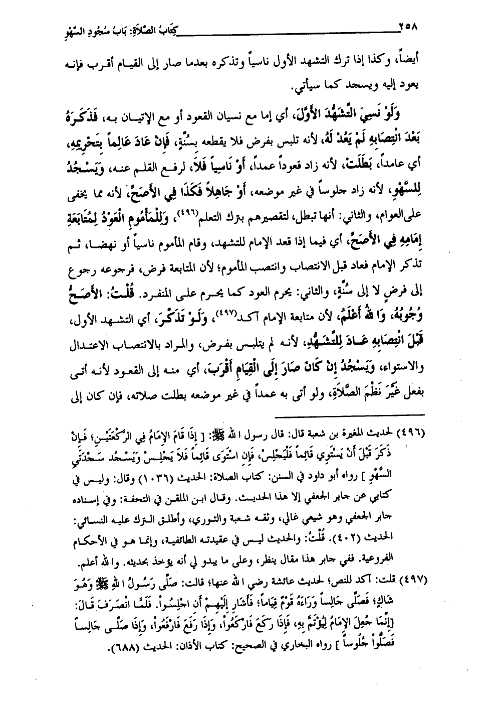(¬496) لحديث المغيرة بن شعبة قال: قال رسول الله - صلى الله عليه وسلم -: [إِذَا قَامَ الإِمَامُ فِي الرَّكْعَتَيْنِ؛ فَإِنْ ذَكَرَ قَبْلَ أَنْ يَسْتَوِي قَائِمًا فَلْيَجْلِسْ، فَإِنِ اسْتَوَى قَائِمًا فَلاَ يَجْلِسْ وَيَسْجُد سَجْدَتَيِ