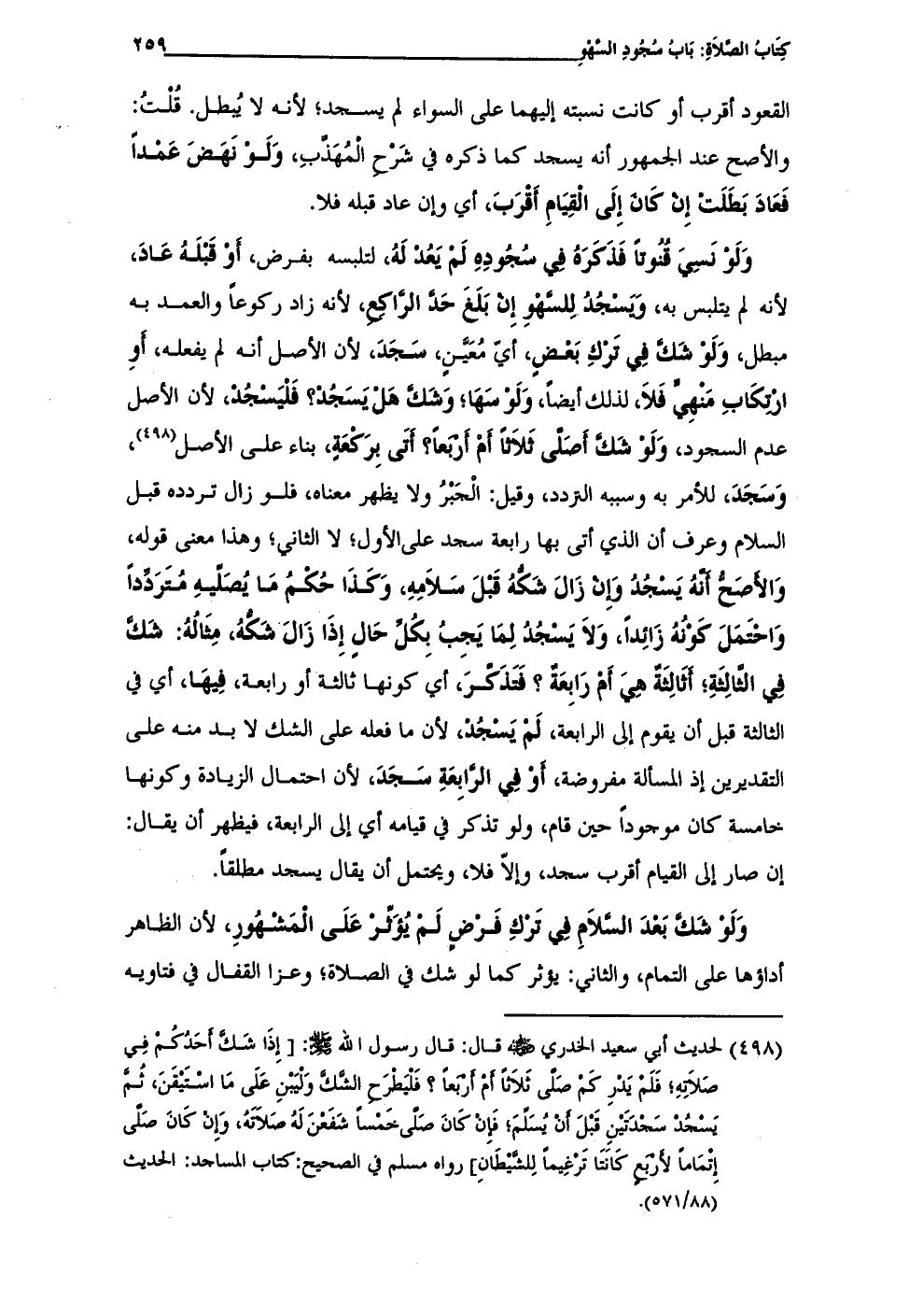 (¬498) لحديث أبي سعيد الخدري - رضي الله عنه - قال: قال رسول الله - صلى الله عليه وسلم -: [إِذَا شَكَّ أَحَدُكُمْ فِي صَلاَتِهِ؛ فَلَمْ يَدْرِ كَمْ صَلَّى ثَلاَثًا أمْ أَرْبَعًا؟ فَلْيَطْرَحِ الشَّكِّ وَلْيَبْنِ عَلَى مَا اسْتَيْقَنَ، ثُمَّ يَسْجُدْ سَجْدَتَيْنِ قَبْلَ أَنْ يُسَلِّمَ؛ فَإِن كَانَ صَلَّى خَمْسًا شَفَعْنَ لَهْ صَلَاتَهُ، وَإِنْ كَانَ صَلَّى