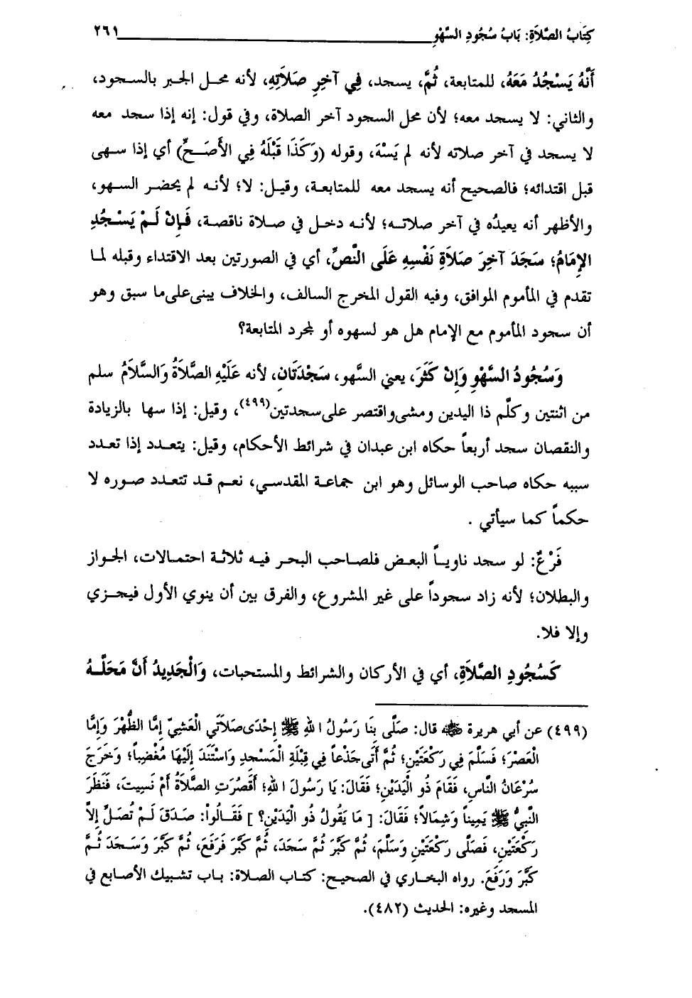(¬499) عن أبي هريرة - رضي الله عنه - قال: صلَّى بنَا رَسُولُ الله - صلى الله عليه وسلم - إِحْدَى صَلَاتَي العَشِيّ إِمَّا الظُّهْرَ وَإِمَّا العَصْرَ؛ فَسَلَّمَ فِي رَكْعَتَيْنِ؛ ثُمَّ أَتَى جَذْعًا فِي قِبْلَةِ الْمَسْجِدِ وَاسْتَنَدَ إلَيْهَا مُغْضِبًا؛ وَخَرَجَ سُرْعَانُ النَّاسِ، فَقَامَ ذُو الْيَدَيْنِ؛ فَقَالَ: يَا رَسُولَ اللهِ؛ أقَصُرَتِ الصَّلَاة أَمْ نَسِيتَ، فَنَظَرَ النَّبِيُّ - صلى الله عليه وسلم - يَمِينًا وَشِمالًا؛ فَقَالَ: [مَا يَقُولُ ذُو الْيَديْنِ؟ ] فَقَالُوا: صَدَقَ لَمْ تُصَلِّ إِلَّا رَكْعَتَينِ، فَصَلَّى رَكْعَتَيْنِ وَسَلِّمَ، ثُمَّ كَبَّرَ ثُمَّ سَجَدَ، ثُمَّ كَبَّرَ فَرَفَعَ، ثُمَّ كَبَّرَ وَسَجَدَ ثُمَّ