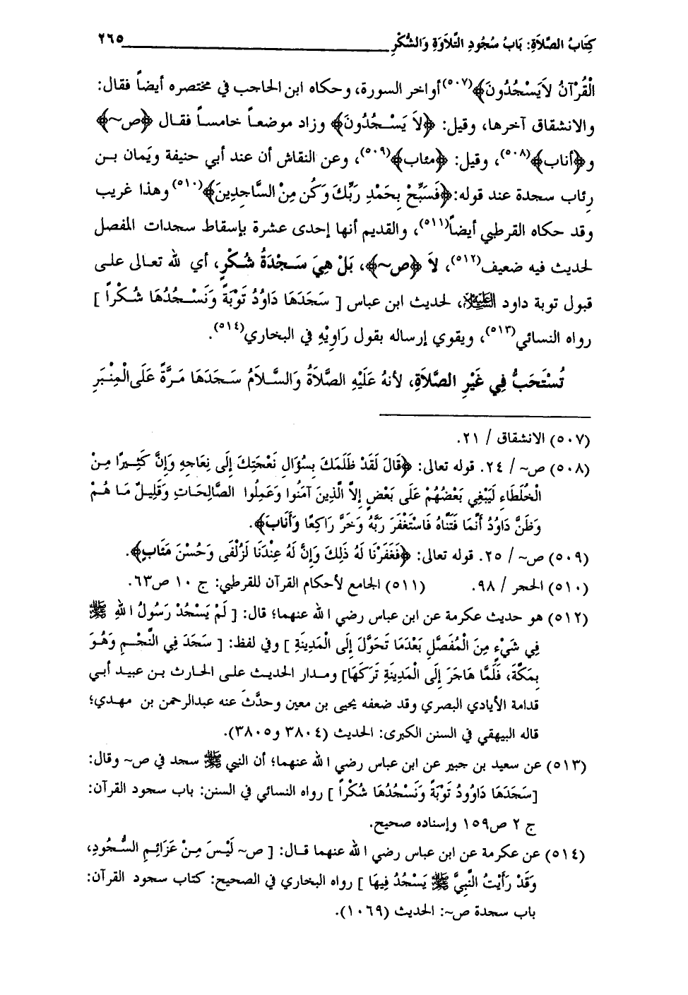 (¬514) عن عكرمة عن ابن عباس رضي الله عنهما قال: [ص لَيْسَ مِنْ عَزَائِمِ السُّجُودِ، وَقَدْ رَأَيْتُ النَّبِيَّ - صلى الله عليه وسلم - يَسْجُدُ فِيهَا] رواه البخاري في الصحيح: كتاب سجود القرآن: