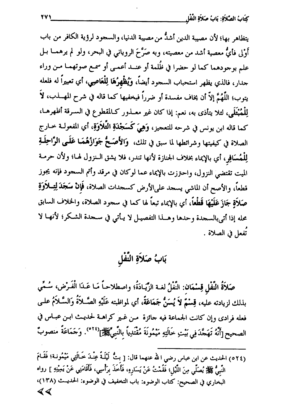 صَلاَةُ النَّفْلِ قِسْمَانِ: النَّفْلُ لغة الزَّيَادَةُ؛ واصطلاحاً مَا عَدَا الْفَرْض، سُمِّي بذلك لزيادته عليه، قِسْمٌ لاَ يُسَن جَمَاعَةً، أي لمواظبته عَلَيْهِ الصَّلاَةُ وَالسَّلاَمُ على فعله فرادى وإن كانت الجماعة فيه جائزة من غير كراهة لحديث ابن عباس في الصحيح [أَنَّهُ تَهَجَّدَ فِي بَيْتِ خَالَتِهِ مَيْمُونَةَ مُقْتَدِياً بِالنبِيِّ - صلى الله عليه وسلم -] (¬524)، . وَجَمَاعَةً منصوبٌ