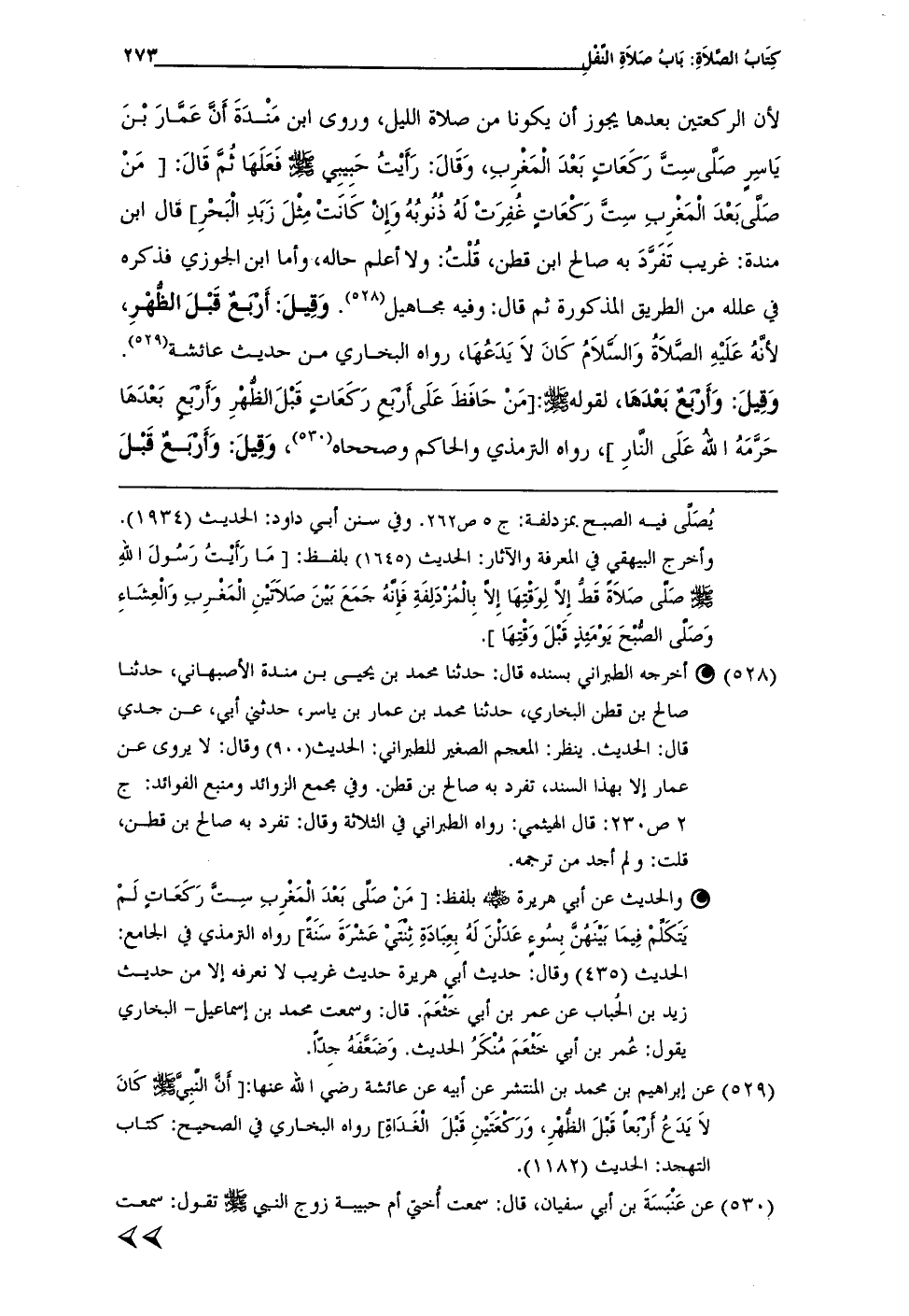* والحديث عنِ أبي هريرة - رضي الله عنه - بلفظ: [مَنْ صَلَّى بَعْدَ الْمَغْرِبِ سِتَّ رَكَعَاتٍ لَمْ يَتَكَلَّمْ فِيمَا بَيْنَهُنَّ بِسُوءٍ عَدَلْنَ لَهُ بِعِبَادَةِ ثِنْتَيْ عَشْرَةَ سَنَةً] رواه الترمذي في الجامع: الحديث (435) وقال: حديث أبيِ هريرة حديث غريب لا نعرفه إلا من حديث زيد بن الحُباب عن عمر بن أبي خَثْعَمَ. قال: وسمعت محمد بن إسماعيل- البخاري يقول: عُمر بن أبي خَثْعَمَ مُنْكَرُ الحديث. وَضَعَّفَهُ جِدّاً.