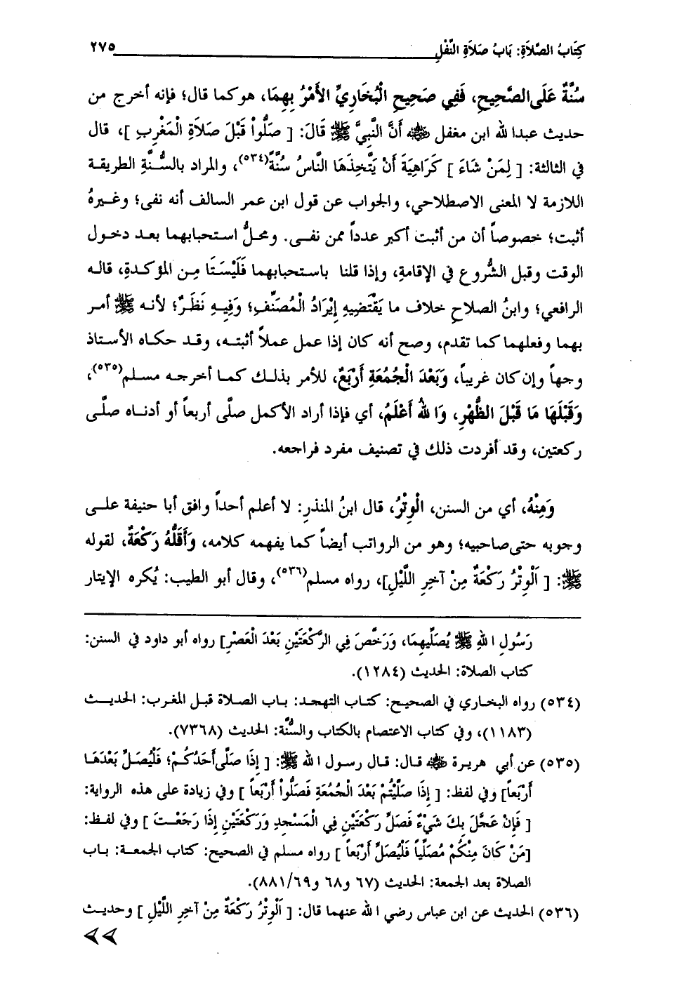 (¬535) عن أبي هريرة - رضي الله عنه - قال: قال رسول الله - صلى الله عليه وسلم -: [إِذَا صَلَّى أَحَدُكُمْ؛ فَلْيُصَلِّ بَعْدَهَا أَرْبَعاً] وفي لفظ: [إِذَا صَلَّيْتُمْ بَعْدَ الْجُمُعَةِ فَصَلُّواْ أَرْبَعاً] وفي زيادة على هذه الرواية: [فَإِنْ عَجَّلَ بِكَ شَيْءٌ فَصَلِّ رَكْعَتَيْنِ الْمَسْجِدِ وَرَكْعَتَيْنِ إِذاَ رَجَعْتَ] وفي لفظ: [مَنْ كَانَ مِنْكُمْ مُصَلَّياً فَلْيُصَلِّ أَرْبَعاً] رواه مسلم في الصحيح: كتاب الجمعة: باب الصلاة بعد الجمعة: الحديث (67 و 68 و 69/ 881).