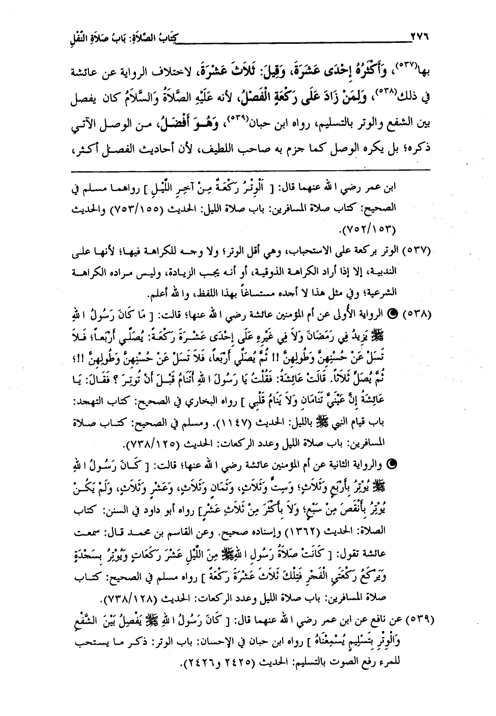 (¬538) * الرواية الأُولى عن أم المؤمنين عائشة رضي الله عنها؛ قالت: [مَا كَانَ رَسُولُ اللهِ - صلى الله عليه وسلم - يزيدُ فِي رَمَضَانَ وَلاَ فِي غَيْرِهِ عَلَى إحْدَى عَشْرَةَ رَكْعَةَ: يُصَلّي أَرْبَعاً؛ فَلاَ تَسَلْ عَنْ حُسْنهِنَّ وَطُولِهِنَّ! ! ثُمَّ يُصَلَّىَ أَرْبَعاً، فَلاَ تَسَلْ عَنْ حُسْنِهِنَّ وَطُولهِنَّ! ! ؛ ثُمَّ يُصَلِّ ثَلاَثاً. قَالَتْ عَائِشَةُ: فَقُلْتُ يَا رَسُولَ اللهِ أَتَنَامُ قَبْلَ أَنْ تُوتِرَ؟ فَقَالَ: يَا عَائِشَهُ إِنَّ عَيْنَيَّ تَنَامَانِ وَلاَ يَنَامُ قَلْبِي] رواه البخاري في الصحيح: كتاب التهجد: باب قيام النبي - صلى الله عليه وسلم - بالليل: الحديث (1147). ومسلم في الصحيح: كتاب صلاة المسافرين: باب صلاة الليل وعدد الركعات: الحديث (125/ 738).