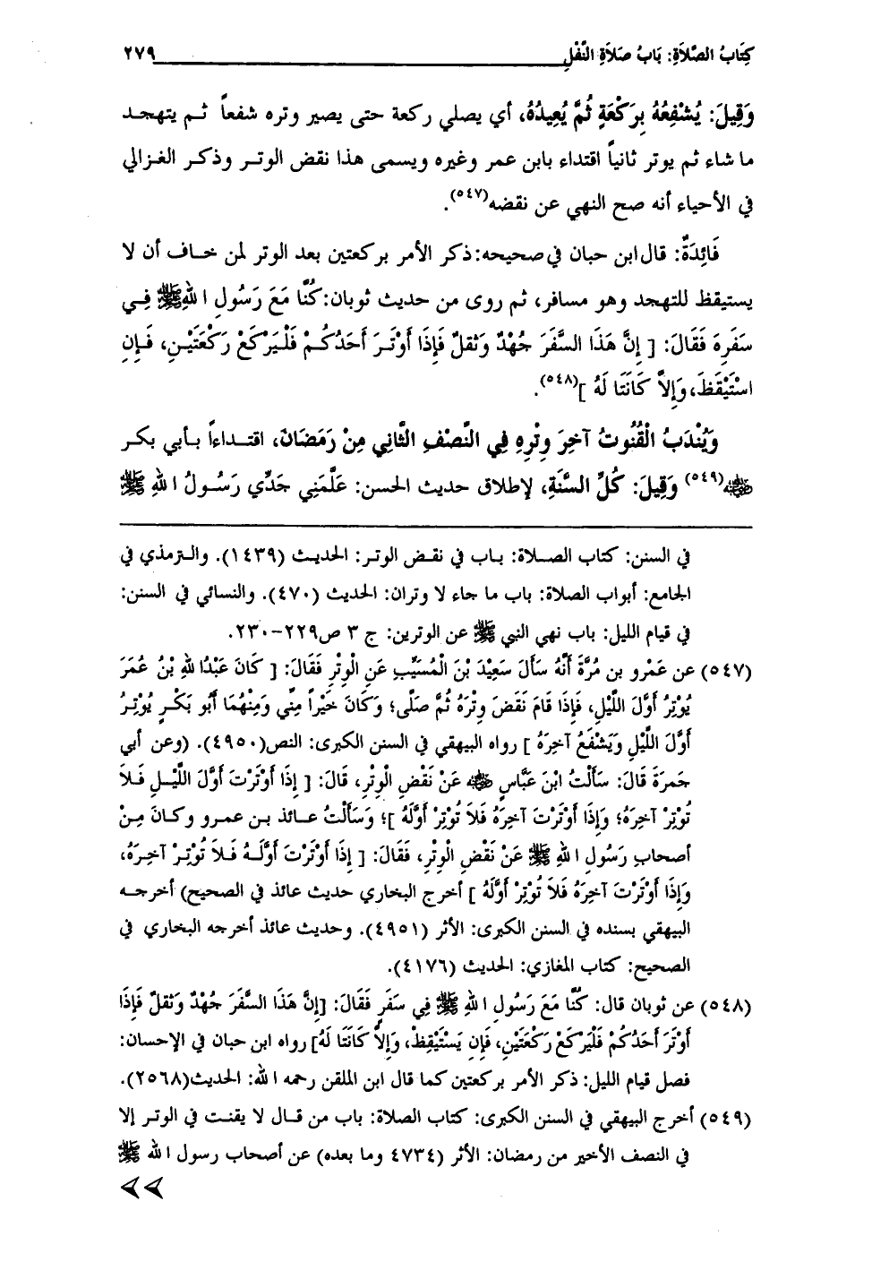 (¬547) عن عَمْرو بن مُرَّةَ أَنَّهُ سَأَلَ سَعِيْدَ بْنَ الْمُسَيِّبِ عَنِ الْوِتْرِ فَقَالَ: [كَانَ عَبْدُ اللهِ بْنُ عُمَرَ يُوْتِرُ أَوَّلَ اللَّيْلِ، فَإِذَا قَامَ نَقَضَ وِتْرَهُ ثُمَّ صَلَّى؛ وَكَانَ خَيْراً مِنَّي وَمِنْهُمَا أَبُو بَكْرٍ يُوْتِرُ أَوَّلَ اللَّيْل وَيَشْفَعُ آخِرَهُ] رواه البيهقي في السنن الكبرى: النص (4950). (وعن أبي جَمرَةَ قاَلَ: سَأَلْتُ ابْنَ عَبَّاسٍ - رضي الله عنه - عَنْ نَقْضِ الْوِتْر، قَالَ: [إِذَا أَوْتَرْتَ أَوَّلَ اللَّيْلِ فَلاَ تُوْتِرْ أخِرَهُ؛ وَإِذَا أَوْتَرْتَ آخِرَهُ فَلاَ توْتِرْ أَوَّلَهُ]؛ وسَأَلْتُ عائذ بن عمرو وكانَ مِنْ أصحاب رَسُولِ الله - صلى الله عليه وسلم - عَنْ نَقْضِ الْوِتْرِ، فَقَالَ: [إِذَا أوْتَرْتَ أَوَّلَهُ فَلاَ تُوْتِر آخِرَهُ، وَإِذَا أوْتَرْتَ آخِرَهُ فَلاَ تُوْتِر أَوَّلَهُ] أخرج البخاري حديث عائذ في الصحيح) أخرجه البيهقي بسنده في السنن الكبرى: الأثر (4951). وحديث عائذ أخرجه البخاري في الصحيح: كتاب المغازي: الحديث (4176).