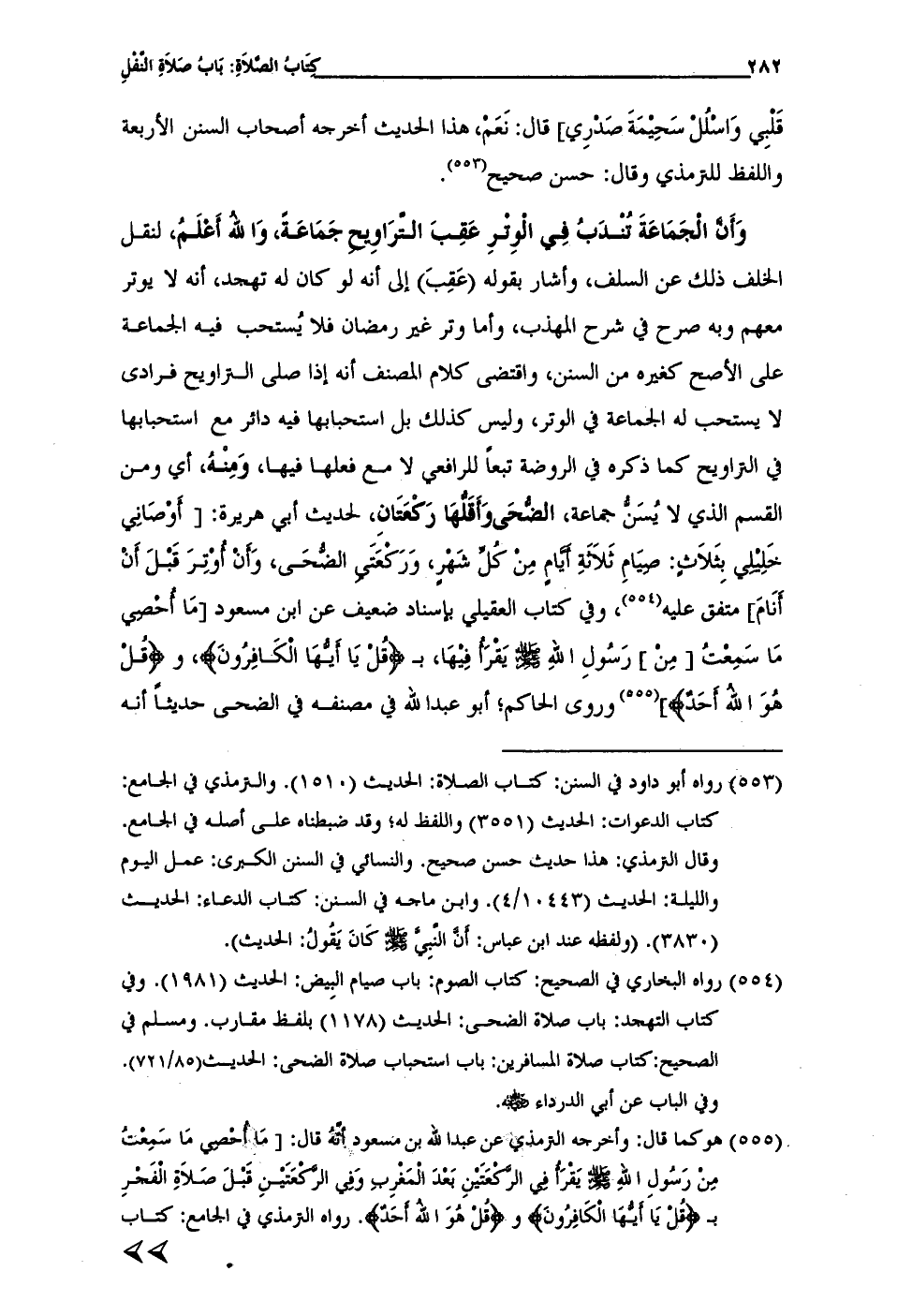 وَأَنَّ الْجَمَاعَةَ تُنْدَبُ فِي الْوِتْرِ عَقِبَ التَّرَاوِيحِ جَمَاعَةً، وَاللهُ أَعْلَمُ، لنقل الخلف ذلك عن السلف، وأشار بقوله (عَقِبَ) إلى أنه لو كان له تهجد، أنه لا يوتر معهم وبه صرح في شرح المهذب، وأما وتر غير رمضان فلا يُستحب فيه الجماعة على الأصح كغيره من السنن، واقتضى كلام المصنف أنه إذا صلى التراويح فرادى لا يستحب له الجماعة في الوتر، وليس كذلك بل استحبابها فيه دائر مع استحبابها في التراويح كما ذكره في الروضة تبعاً للرافعي لا مع فعلها فيها، وَمِنْهُ، أى ومن القسم الذي لا يُسَنُّ جماعة، الضُّحَى وَأَقَلْهَا رَكْعَتَانِ، لحديث أبي هريرة: [أوْصَانِي خَلِيْلِي بِثَلاَثٍ: صِيَامِ ثَلاثَةِ أَيَّامٍ مِنْ كُلِّ شَهْرٍ، وَرَكْعَتَيِ الضُّحَى، وَأَنْ أُوْتِرَ قَبْلَ أَنْ أَنَامَ] متفق عليه (¬554)، وفي كتاب العقيلي بإسناد ضعيف عن ابن مسعود [مَا أُحْصِي مَا سَمِعْتُ [مِنْ] رَسُولِ اللهِ - صلى الله عليه وسلم - يَقْرَأُ فِيْهَا، بـ {قُلْ يَاأَيُّهَا الْكَافِرُونَ}، و {قُلْ هُوَ اللَّهُ أَحَدٌ}] (¬555) وروى الحاكم؛ أبو عبد الله في مصنفه في الضحى حديثاً أنه