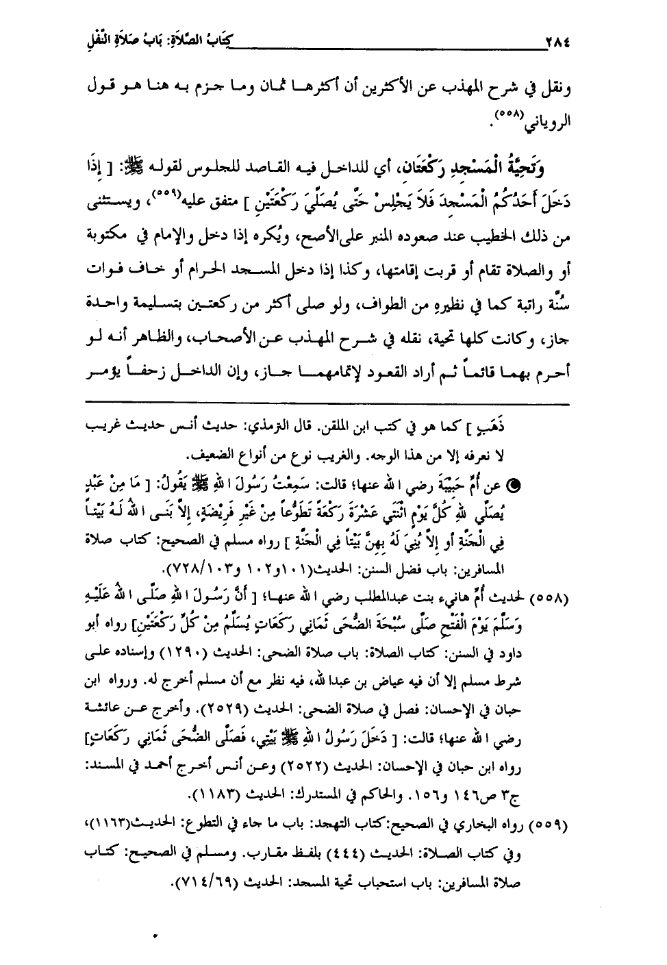 دَخَلَ أَحَدُكُمُ الْمَسْجِدَ فَلاَ يَجْلِسْ حَتَّى يُصَلِّىَ رَكْعَتَيْنِ] متفق عليه (¬559)، ويستثنى من ذلك الخطب عند صعوده المنبر على الأصح، ويُكره إذا دخل والإمام في مكتوبة أو والصلاة تقام أو قربت إقامتها، وكذا إذا دخل المسجد الحرام أو خاف فوات سُنَّة راتبة كما في نظرهِ من الطواف، ولو صلى أكثر من ركعتين بتسليمة واحدة جاز، وكانت كلها تحية، نقله في شرح المهذب عن الأصحاب، والظاهر أنه لو أحرم بهما قائماً ثم أراد القعود لإتمامهما جاز، وإن الداخل زحفًا يؤمر