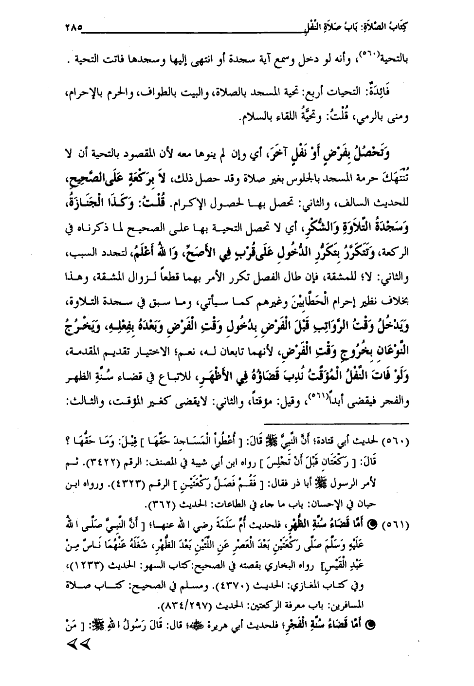 (¬560) لحديث أبى قتادة؛ أَنَّ النَّبِيَّ - صلى الله عليه وسلم - قَالَ: [أُعْطُواْ الْمَسَاجِدَ حَقِّهَا] قِيْلَ: وَمَا حَقُّهَا؟ قَالَ: [رَكْعَتَان قَبْلَ أَنْ تَجْلِسَ] رواه ابن أبى شيبة في المصنف: الرقم (3422). ثم لأمر الرسول - صلى الله عليه وسلم - أبا ذر فقال: [فَقُمْ فَصَلِّ رَكْعَتَيْنِ] الرقم (4323). ورواه ابن