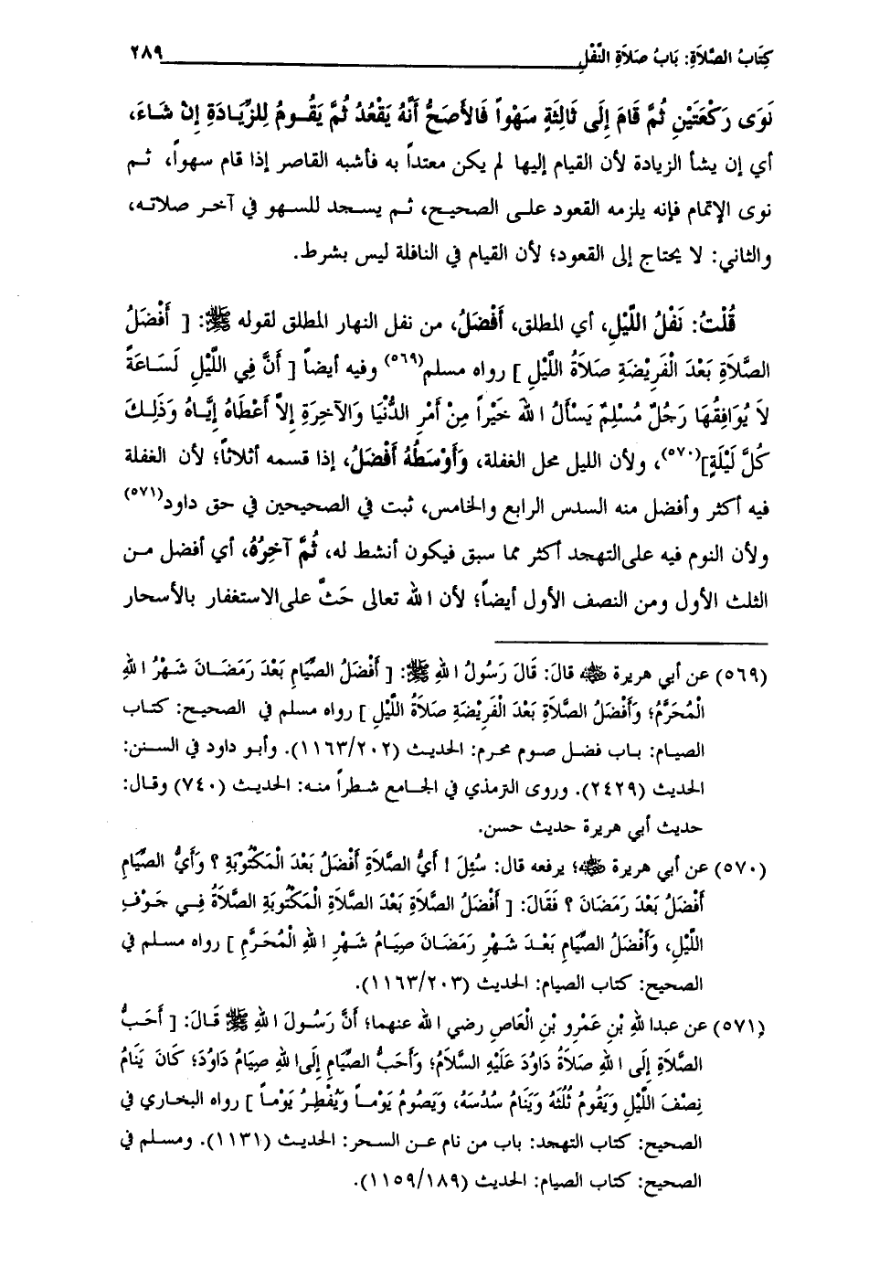(¬569) عن أبي هريرة - رضي الله عنه - قالَ: قَالَ رَسُولُ اللهِ - صلى الله عليه وسلم -: [أَفْضَلُ الصِّيَامِ بَعْدَ رَمَضَانَ شَهْرُ اللهِ الْمُحْرِّمُ؛ وَأَفْضَلُ الصَّلاَةِ بَعْدَ الْفَرِيْضَةِ صَلاَةُ اللَّيْلِ] رواه مسلم في الصحيح: كتاب الصيام: باب فضل صوم محرم: الحديث (202/ 1163). وأبو داود في السنن: