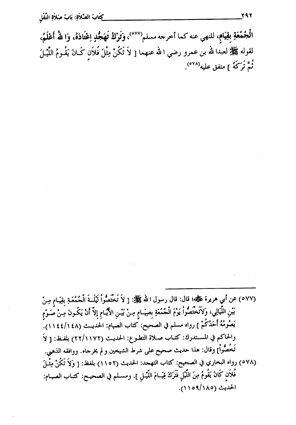 (¬577) عن أبي هريرة - رضي الله عنه -؛ قال: قال رسول الله - صلى الله عليه وسلم -: [لاَ تَخْتَصُّواْ لَيْلَةَ الْجُمُعَةِ بِقِيَامٍ مِنْ بَيْنِ اللَّيَالِي، وَلاَ تَخْتَصُّواْ يَوْمَ الْجُمُعَةِ بِصِيَامِ مِنْ بَيْنِ الأَيَّامِ إِلَّا أَنْ يَكُونَ مِنْ صَوْمٍ يَصُومُهُ أَحَدُكُمْ] رواه مسلم في الصَّحيح: كتاب الصيام: الحديث (148/ 1144).