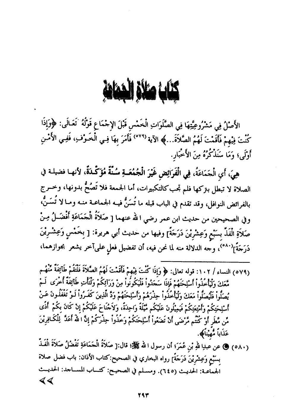 (¬580) * عن عبدِاللهِ بْنِ عُمَرَ؛ أن رسول الله - صلى الله عليه وسلم -؛ قال: [صَلاَةُ الْجَمَاعَةِ تَفْضُلُ صَلاَةَ الفَذِّ بِسَبْعٍ وَعِشْرِيْنَ دَرَجَةً] رواه البُخاريّ في الصَّحيح: كتاب الأذان: باب فضل صلاة
