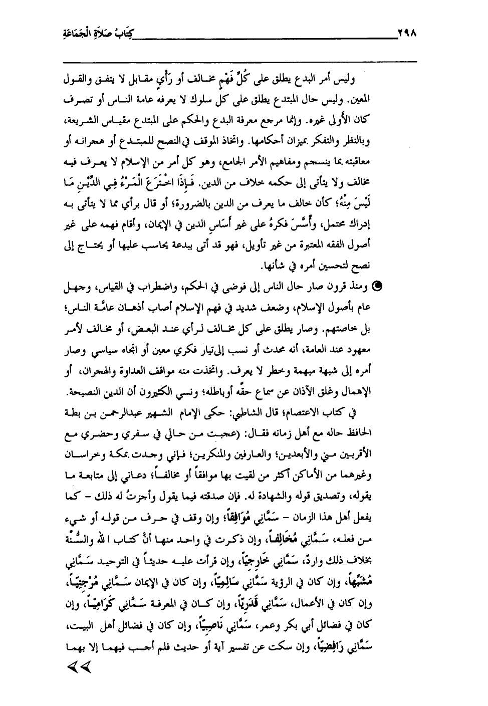 في كتاب الاعتصام؛ قال الشاطبي: حكى الإمام الشهير عبد الرحمن بن بطة الحافظ حاله مع أهل زمانه فقال: (عجبت من حالي في سفرى وحضرى مع الأقربين مني والأبعدين؛ والعارفين والمنكرين؛ فإنى وجدت. بمكة وخراسان وغيرهما من الأماكن أكثر من لقيت بها مرافقاً أو مخالفاً؛ دعانى إلى متابعة ما