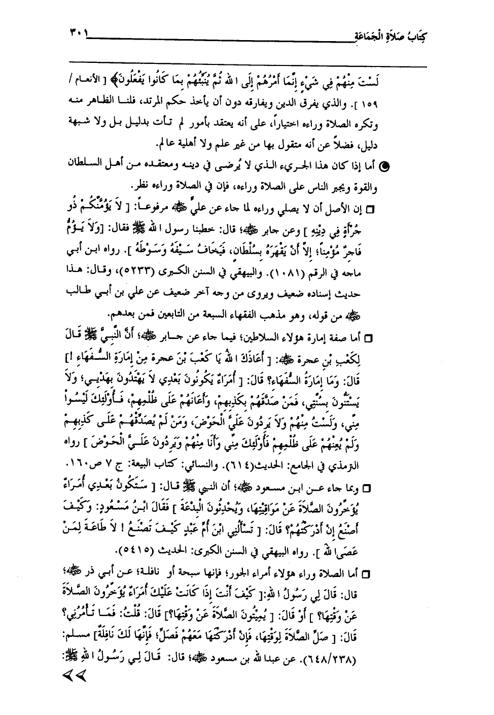 • أما الصلاة وراء هؤلاء أمراء الجور؛ فإنَّها سبحة أو نافلة؛ عن أبي ذر -رَضِيَ الله عَنْهُ-؛ قال: قَالَ لِي رَسُولُ اللَهِ: [كَيْفَ أَنْتَ إِذَا كَانَتْ عَلَيْكَ أُمَرَاءً يُؤَخِّرُونَ الصَّلاَةَ عَنْ وَقْتِهَا؟ ] أَوْ قَالَ: [يُمِيْتُونَ الصَّلاَةَ عَنْ وَقْتِهَا؟ ] قَالَ: قُلْتُ: فَمَا تَأْمُرُنِي؟ قَالَ: [صَلِّ الصَّلاَةَ لِوَقْتِهَا، فَإِنْ أَدْرَكْتَهَا مَعَهُمْ فَصَلِّ؛ فَإِنَّهَا لَكَ نَافِلَةٌ] مسلم: (238/ 648). عن عبد الله بن مسعود - رضي الله عنه -؛ قال؟ قَالَ لِي رَسُولُ اللهِ - صلى الله عليه وسلم -: =