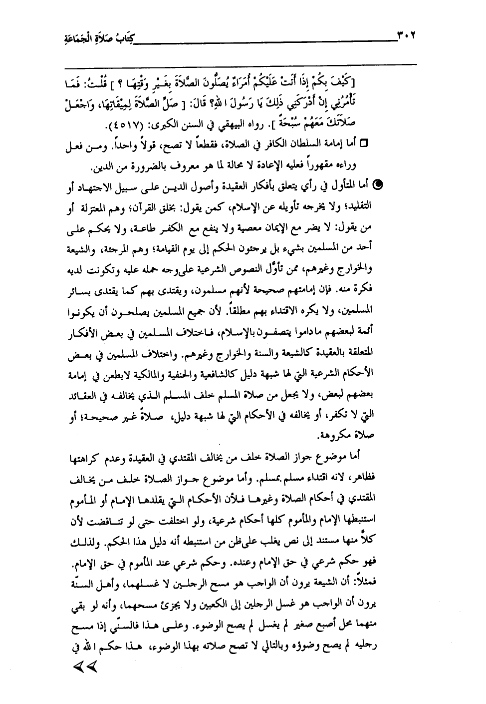 • أما إمامة السلطان الكافر في الصلاة، فقطعًا لا تصح، قولًا واحدًا. ومن فعل وراءه مقهورًا فعليه الإعادة لا محالة لما هو معروف بالضرورة من الدين.