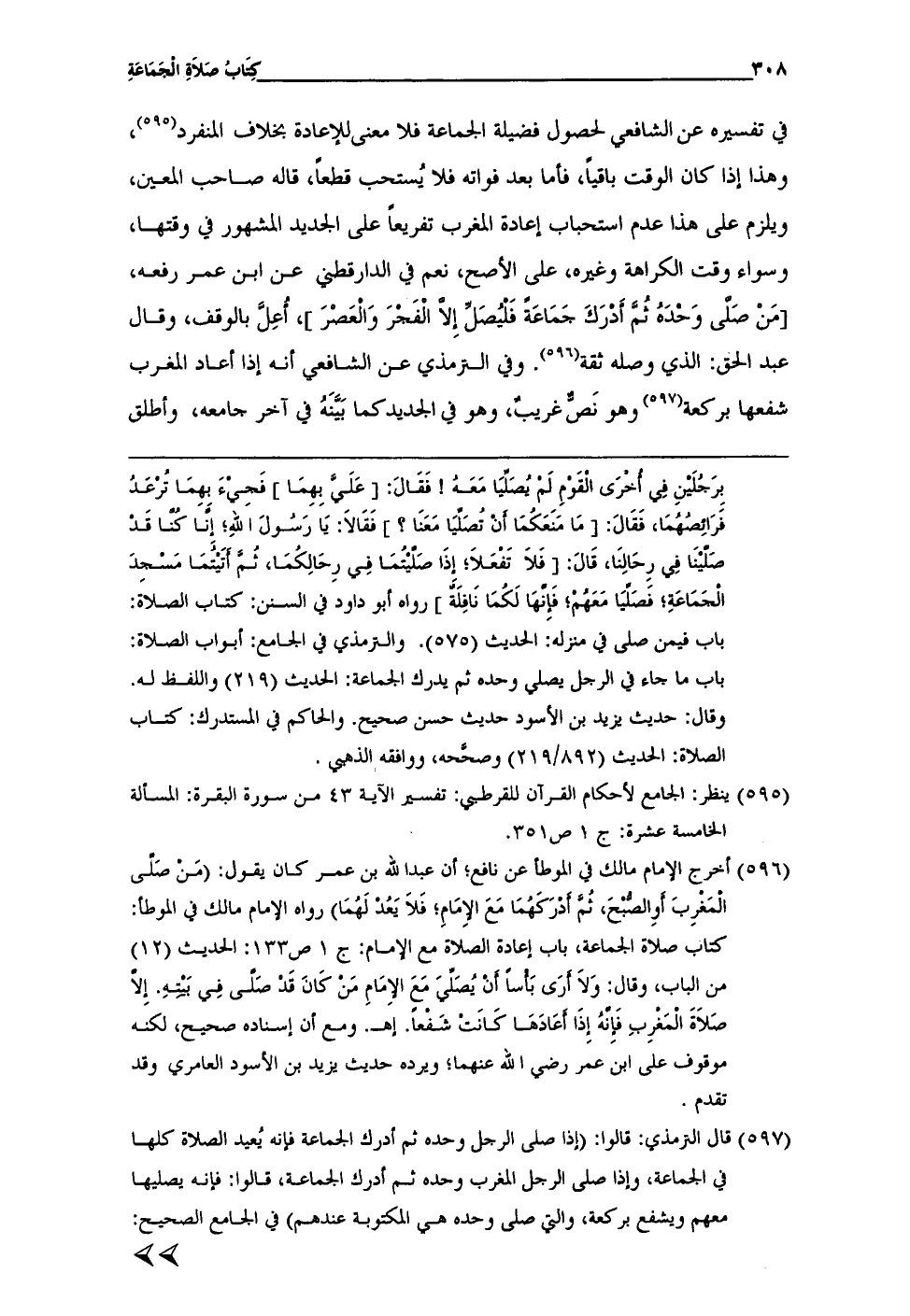 (¬597) قال الترمذي: قالوا: (إذا صلى الرَّجل وحده ثم أدرك الجماعة فإنَّه يُعيد الصلاة كلها في الجماعة، وإذا صلى الرجل المغرب وحده ثم أدرك الجماعة، قالوا: فإنَّه يصليها معهم ويشفع بركعة، والتي صلى وحده هي المكتوبة عندهم) في الجامع الصحيح: =
