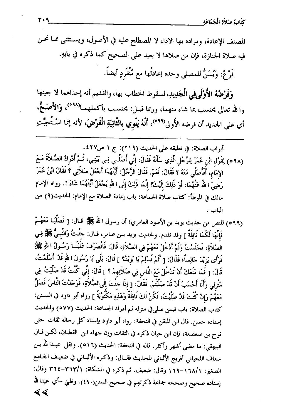 (¬599) للنص من حديث يزيد بن الأسود العامري؛ أن رسول الله - صلى الله عليه وسلم - قال: [فَصَلِّيَا مَعَهُمْ فَإِنَّهَا لَكُمَا نَافِلَةٌ] وقد تقدم. ولحديث يزيد بن عامر، قال: جِئْتُ وَالنَّبِيُّ - صلى الله عليه وسلم - فِي الصَّلاَةِ، فَجَلَسْتُ وَلَمْ أَدْخُلْ مَعَهُمْ فِي الصَّلَاةِ، قَالَ: فَانْصَرَفَ عَلَيْنَا رَسُولُ الله - صلى الله عليه وسلم - فَرَأَى يَزِيْدَ جَالِسًا؛ فَقَالَ: [أَلَمْ تُسْلِمْ يَا يِزِيْدُ؟ ] قَالَ: بَلَى يَا رَسُولَ اللهِ قَدْ أَسْلَمْتُ، قَالَ: [فَمَا مَنَعَكَ أَنْ تَدْخُلَ مَعَ النَّاسِ فِي صَلَاتِهِمْ؟ ] قَالَ: إِنِّى كُنْتُ قَدْ صَلَّيْتُ فِي مَنْزِلِي وَأنَا أَحْسَبُ أَنْ قَدْ صَلَّيتُمْ. فَقَالَ: [إِذَا جِئْتَ إلَى الصَّلَاةِ، فَوَجَدْتَ النَّاسَ فَصَلِّ مَعَهُمْ وَإِنْ كُنْتَ قَدْ صَلَّيْتَ، تَكُنْ لَكَ نَافِلَةً وَهَذِهِ مَكْتُوْبَةً] رواه أبو داود في السنن: كتاب الصلاة: باب فيمن صلى في منزله ثم أدرك الجماعة: الحديث (577) والحديث إسناده حسن. قال ابن الملقن في التحفة: رواه أبو داود بإسناد كل رجاله ثقات حتَّى نوح بن صعصعة، فإن ابن حبان ذكره في الثِّقات وإن جهله ابن القطَّان، لكن قال البيهقي؛ ما مضى أشهر وأكثر. قاله في التحفة: الحديث (516). ونقل عبد الله بن