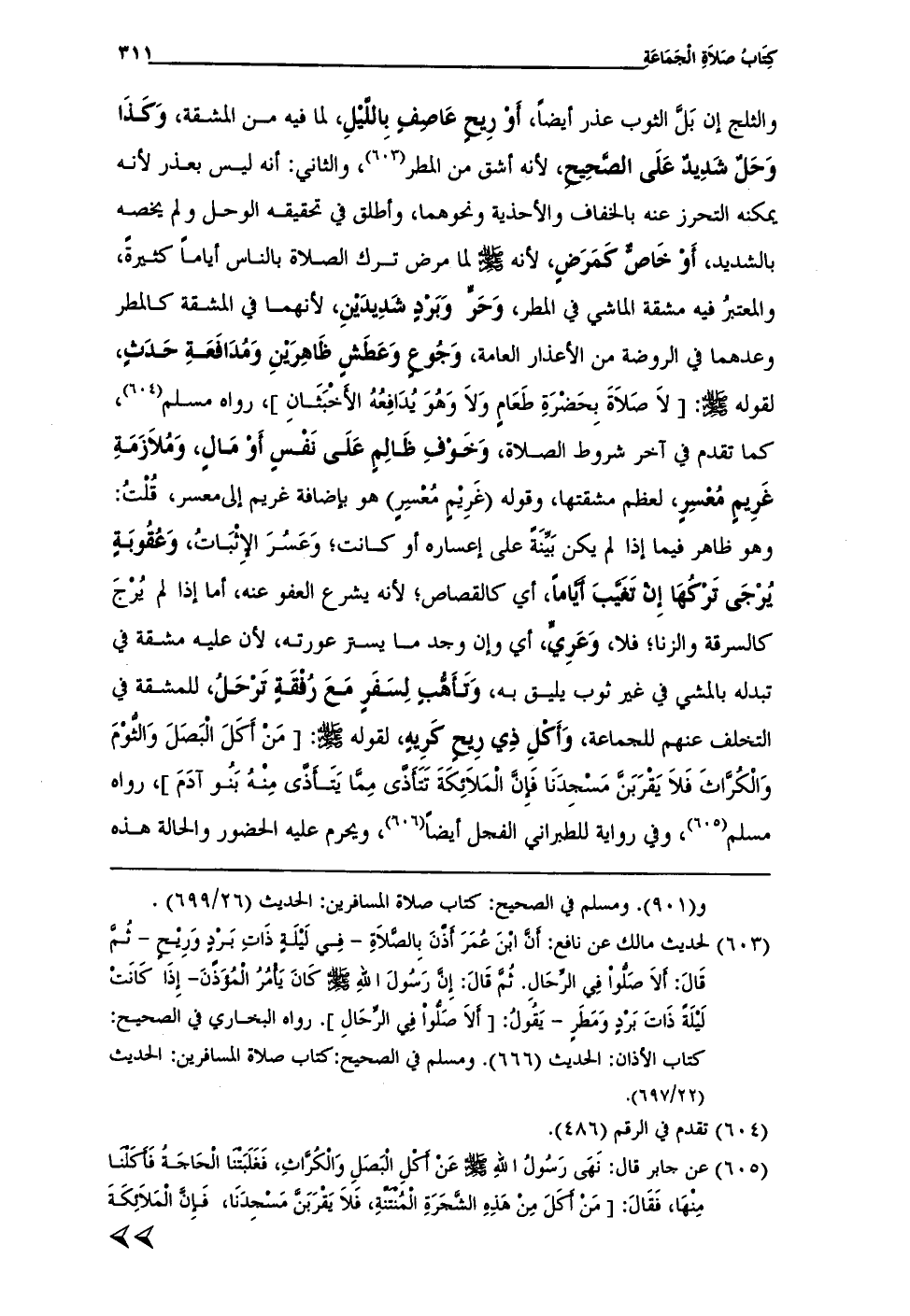 والثلج إن بَلُّ الثوب عذر أيضاً، أوْ رِيحٍ عَاصِفٍ بِاللَّيْلِ، لما فيه من المشقة، وَكَذَا وَحَلٌ شَدِيدٌ عَلَى الصَّحِيحِ، لأنه أشق من المطر (¬603)، والثاني: أنه ليس بعذر لأنه يمكنه التحرز عنه بالخفاف والأحذية ونحوهما، وأطلق في تحقيقه الوحل ولم يخصه بالشديد، أَوْ خَاصُّ كَمَرَضٍ، لأنه - صلى الله عليه وسلم - لما مرض ترك الصلاة بالناس أياماً كثيرةً، والمعتبرُ فيه مشقة الماشي في المطر، وَحَرٍّ وَبَرْدٍ شَدِيدَيْنِ، لأنهما في المشقة كالمطر وعدهما في الروضة من الأعذار العامة، وَجُوعٍ وَعَطَشٍ ظَاهِرَينِ وَمُدَافَعَةِ حَدَثٍ، لقوله - صلى الله عليه وسلم -: [لاَ صَلاَةَ بِحَضْرَةِ طَعَامِ وَلاَ وَهُوَ يُدَافِعُهُ الأَخْبَثَانِ]، رواه مسلم (¬604)، كما تقدم في أخر شروط الصلاة، وَخَوْفِ ظَالِمٍ عَلَى نَفْسٍ أَوْ مَالٍ، وَمُلاَزَمَةِ غَرِيمٍ مُعْسِرٍ، لعظم مشقتها، وقوله (غَرِيْمٍ مُعْسِرٍ) هو بإضافة غريم إلى معسر، قُلْتُ: وهو ظاهر فيما إذا لم يكن بَيِّنَةً على إعساره أو كانت؛ وَعَسُرَ الإِثْبَاتُ، وَعُقُوبَةِ يُرْجَى تَرْكُهَا إِنْ تَغَيَّبَ أيَّاماً، أي كالقصاص؛ لأنه يشرع العفو عنه، أما إذا لم يُرْجَ كالسرقة والزنا؛ فلا، وَعَرِيٍّ، أي وإن وجد ما يستر عورته، لأن عليه مشقة في تبدله بالمشي في غر ثوب يليق به، وَتَأَهُّبٍ لِسَفَرِ مَعَ رُفْقَةِ تَرْحَلُ، للمشقة في التخلف عنهم للجماعة، وَأَكْلِ ذِي رِيحٍ كَرِيهٍ، لقوله - صلى الله عليه وسلم -: [مَنْ أَكَلَ الْبَصَلَ وَالثَّوْمَ وَالْكُرَّاثَ فَلاَ يَقْرَبَنَّ مَسْجِدَنَا فَإِنَّ الْمَلاَئِكَةَ تَتَأَذَّى مِمَّا يَتَأَذَّى مِنْهُ بَنُو آدَمَ]، رواه مسلم (¬605)،