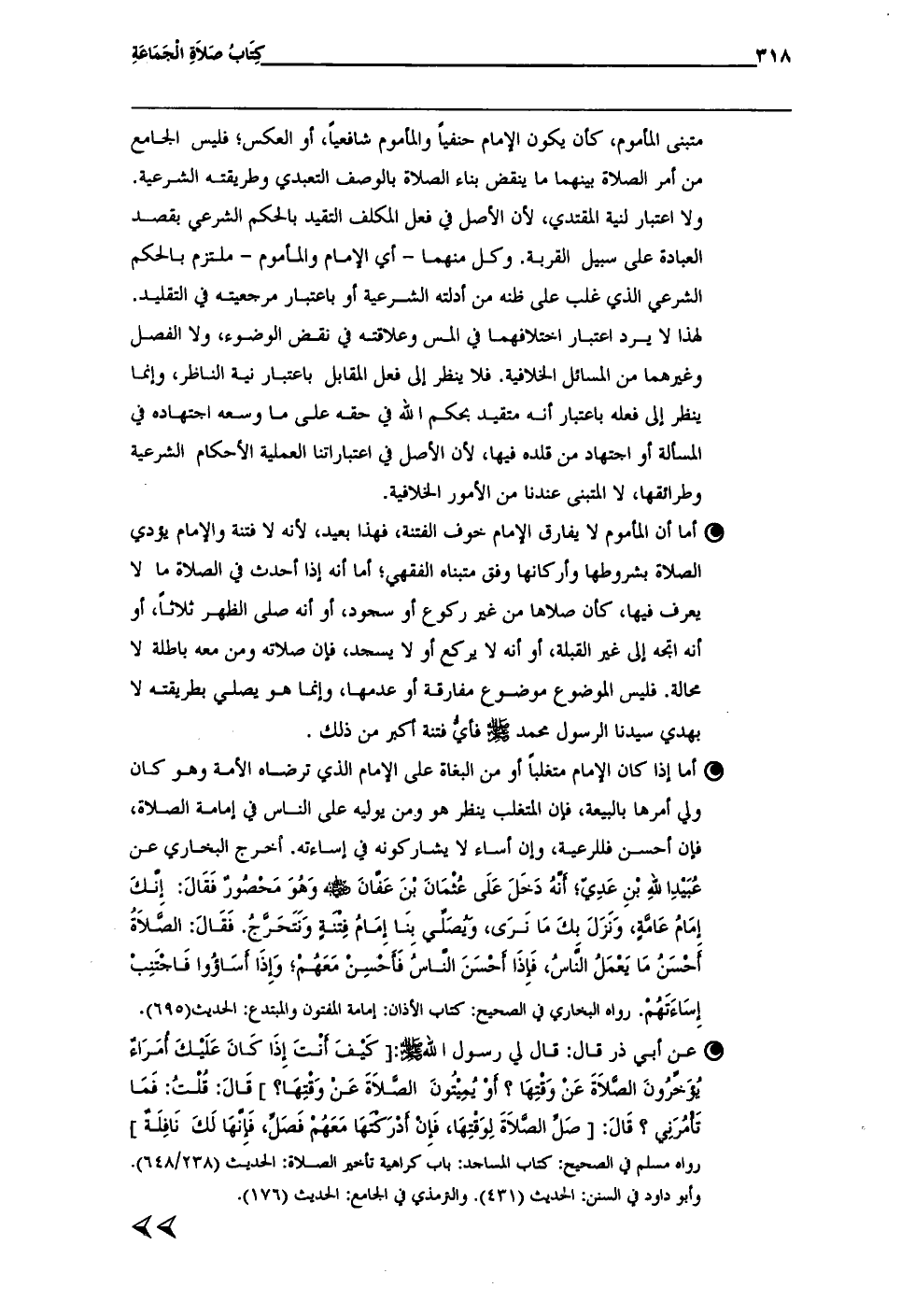*ـ أما أن المأموم لا يفارق الإمام خوف الفتنه، فهذا بعيد، لأنه لا فتنة والإمام يؤدى الصلاة بشروطها وأركانها وفق متبناه الفقهي؛ أما أنه إذا أحدث في الصلاة ما لا يعرف فيها، كأن صلاها من غير ركوع أو سجود، أو أنه صلى الظهر ثلاثاً، أو إنه اتجه إلى غير القبلة، أو أنه لا يركع أو لا يسجد، فإن صلاته ومن معه باطلة لا محالة. فليس الموضوع موضوع مفارقة أو عدمها، وإنما هو يصلي بطريقته لا بهدي سيدنا الرسول محمد - صلى الله عليه وسلم - فأيُّ فتنة أكبر من ذلك.