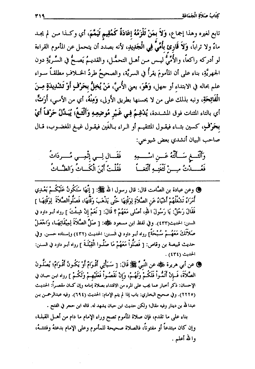تابع لغيره وهذا إجماع، وَلاَ بِمَنْ تلْزَمُهُ إِعَادَةٌ كَمُقِيمٍ تَيَمَّمَ، أي وكذا من لم يجد ماءً ولا تراباً، وَلاَ قَارئ بِأُمِّيَّ فِي الْجَدِيدِ، لأنه بصدد أن يتحمل عن المأموم القراءة لو أدركه راكعاً، والأُمِّيُّ ليس من أهل التحمُّل، والقديمُ يَصحُّ في السَّريُّةِ دون الجهريَّةِ، بناء على أن المأمومَ يقرأ في السريَّة، والصحيحُ طردُ الخلافِ مطلقاً سواء علم بحاله في الابتداءِ أو جهل، وَهُوَ، يعني الأُميُّ، مَنْ يُخِلُّ بِحَرْفٍ أَوْ تَشْدِيدَةٍ مِنَ الْفَاتِحَةِ، ونبه بذلك على من لا يحسنها بطريق الأولى، وَمِنْهُ، أي من الأمي، أَرَتٌّ، أي بالتاء المثنات فوق المشددة، يُدْغِمُ فِي غَيْرِ مُوضِعِهِ وَأَلْثَغٌ؛ يُبَدِّلُ حَرْفاً أَيْ بِحَرْفٍ، كسين بثاء فيقول المثتقيم أو الراء بالغَين فيقول غيغ المغضوب، قال صاحب البيان أنشدي بعض شيوخي: