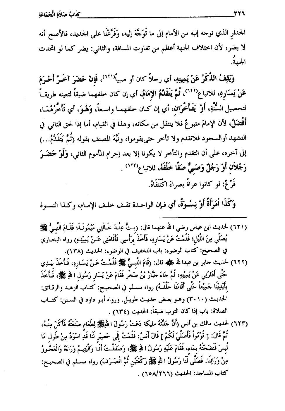 (¬622) لحديث جابر بن عبد الله قال: (قَامَ النَّبِيُّ - صلى الله عليه وسلم - فَقُمْتُ عَنْ يَسَارِهِ، فَأَخَذَ بيَدِي حَتَّى أَدَارَنِي عَنْ يَمِيْنِهِ، ثُمَّ جَاءَ جَبَّارُ بْنُ صَخْر فَقَامَ عَنْ يَسَارِ رَسُولِ اللهِ - صلى الله عليه وسلم -، فَأَخَذَ بِأيْدِينَا جَمِيْعًا حَتَّى أَقَامَنَا خَلْفَهُ) رواه مسلم في الصحيح: كتاب الزهد والرقائق: