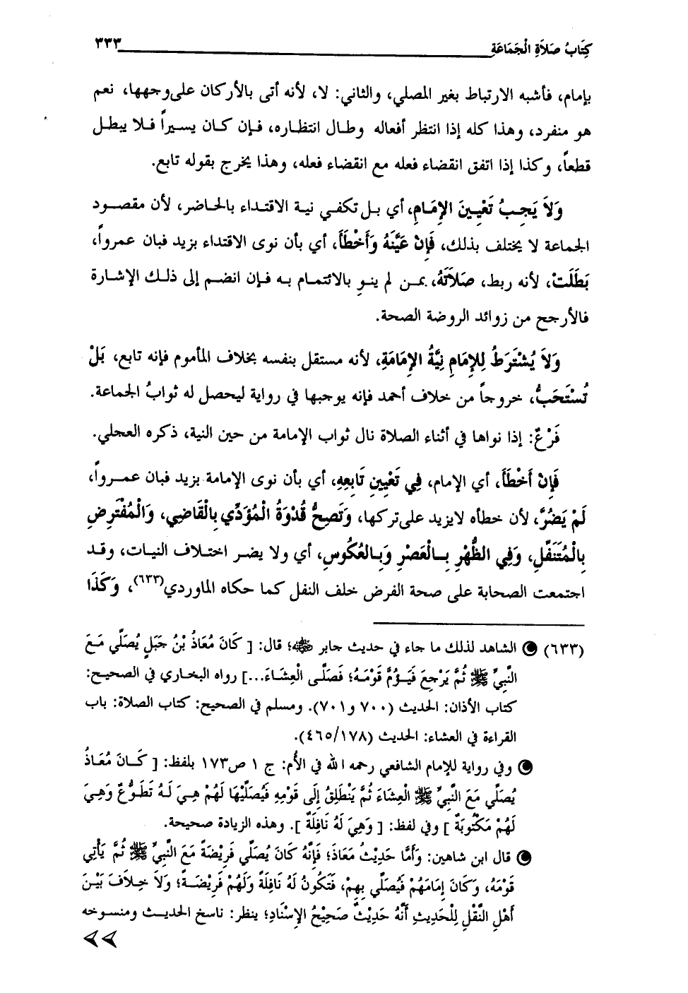 (¬633) • الشاهد لذلك ما جاء في حديث جابر - رضي الله عنه -؛ قال: [كَانَ مُعَاذُ بْنُ جَبَلٍ يُصَلِّي مَعَ النَّبِيِّ - صلى الله عليه وسلم - ثُمَّ يَرْجِعَ فَيَؤُمَّ قَوْمَهُ؛ فَصَلَّى الْعِشَاءَ ... ] رواه البخاري في الصحيح: كتاب الأذان: الحديث (700 و 701). ومسلم في الصحيح: كتاب الصلاة: باب القراءة في العشاء: الحديث (178/ 465).