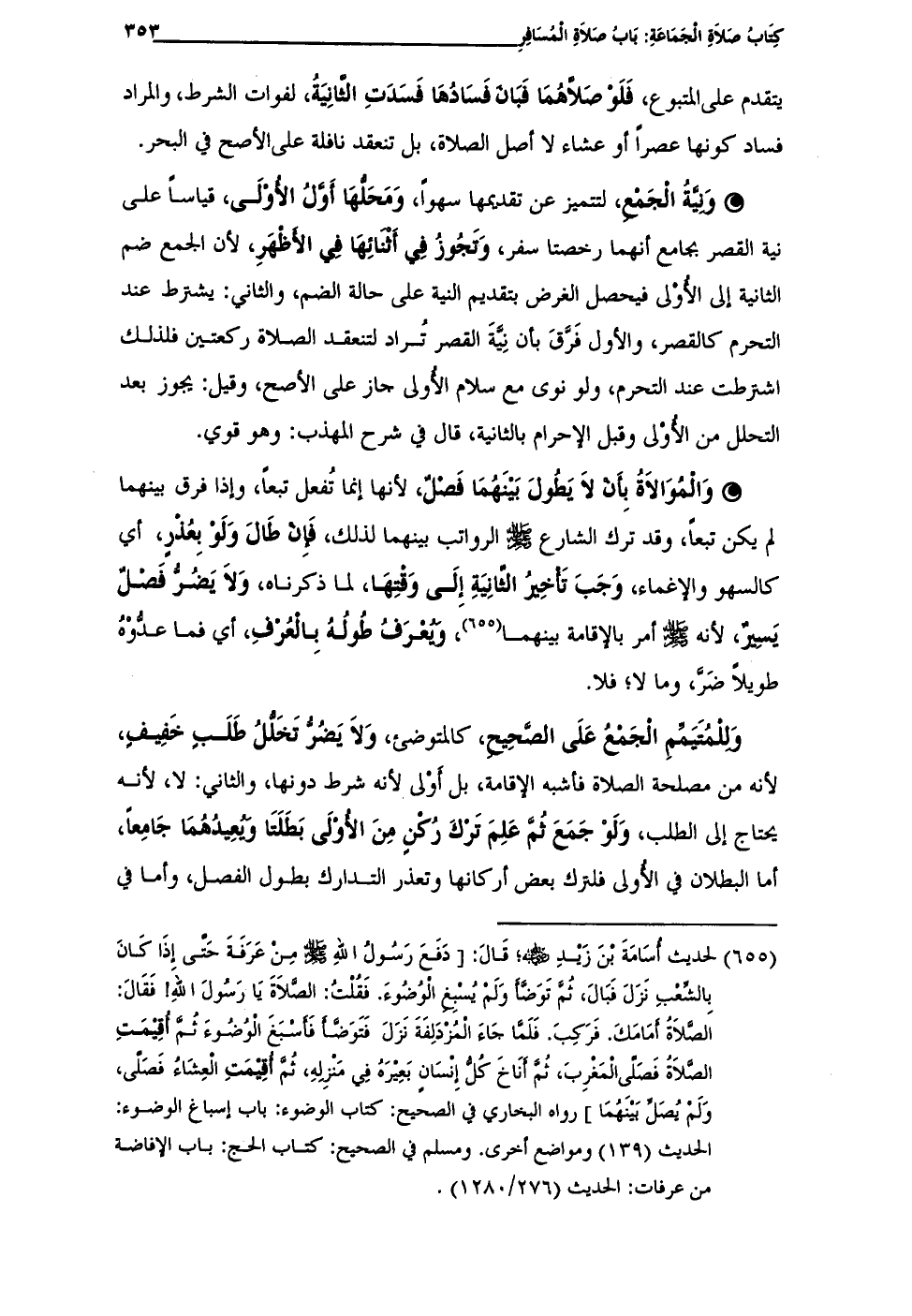 (¬655) لحدبث أُسَامَةَ بْنَ زَيْدِ - رضي الله عنه -؛ قَالَ: [دَفَعَ رَسُولُ اللهِ - صلى الله عليه وسلم - مِنْ عَرَفَةَ حَتَّى إِذَا كَانَ بِالشِّغْبِ نَزَلَ فَبَالَ، ثُمَّ تَوَضَّأَ وَلَمْ يُسْبِغِ الْوُضُوءَ. فَقُلْتُ: الصَّلاَةَ يَا رَسُولَ اللهِ! فَقَالَ: الصَّلاَةُ أَمَامَكَ. فَرَكِبَ. فَلَمَّا جَاءَ الْمُزْدَلِفَةَ نَزَلَ فَتَوَضَّأَ فَأَسْبَغَ الْوُضُوءَ ثُمَّ أُقِيْمَتِ الصَّلاَةُ فَصَلَّى الْمَغْرِبَ، ثُمَّ أَنَاخَ كُلُّ إِنْسَانٍ بَعِيْرَهُ فِي مَنْزِلهِ، ثُمَّ أُقِيْمَتِ الْعِشَاءُ فَصَلَّى، وَلَمْ يُصَلِّ بَيْنَهُمَا] رواه البخاري في الصحيح: كتاب الوضوء: باب إسباغ الوضوء: الحديث (139) ومواضع أخرى. ومسلم في الصحيح: كتاب الحج: باب الإفاضة من عرفات: الحديث (276/ 1280).