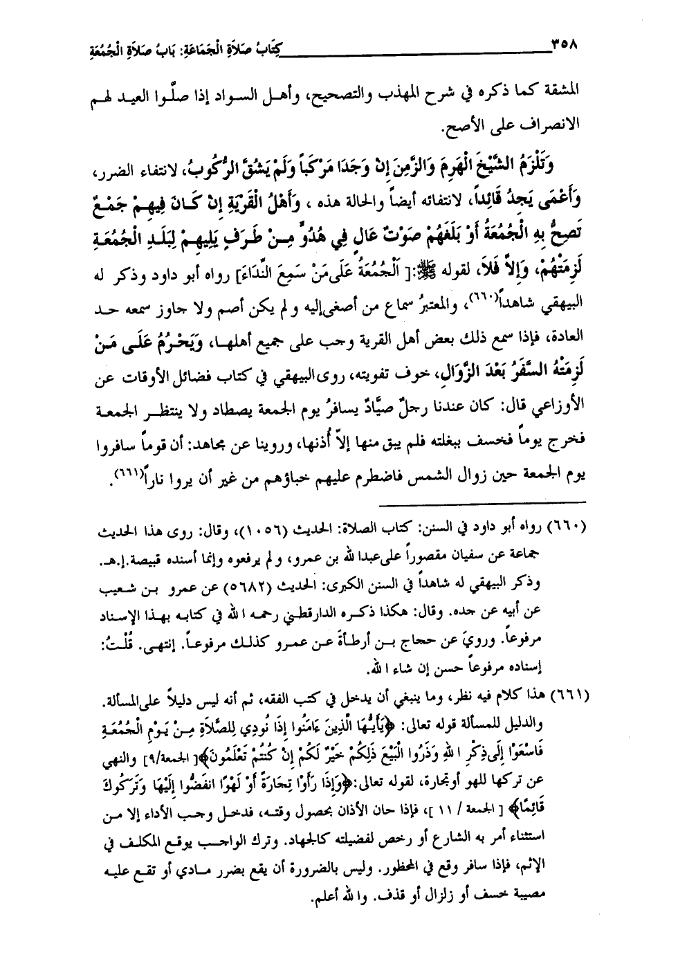 وَتَلْزَمُ الشَّيْخَ الْهَرِمَ وَالزَّمِنَ إِنْ وَجَدَا مَرْكَباً وَلَمْ يَشُقَّ الرُّكُوبُ، لانتفاء الضرر، وَأَعْمَى يَجِدُ قَائِداً، لانتفائه أيضاً والحالة هذه، وَأَهْلُ الْقَرْيَةِ إِنْ كَانَ فِيهِمْ جَمْعٌ تَصِحُّ بِهِ الْجُمُعَةُ أَوْ بَلَغَهُمْ صَوْتٌ عَالٍ فِي هُدُوٍّ مِنْ طَرَفٍ يَلِيهِمْ لِبَلَدِ الْجُمُعَةِ لَزِمَتْهُمْ، وَإِلَّا فَلاَ، لقوله - صلى الله عليه وسلم -: [اَلْجُمُعَةُ عَلَى مَنْ سَمِعَ النِّدَاءَ] رواه أبو داود وذكر له البيهقي شاهداً (¬660)، والمعتبرُ سماع من أصغى إليه ولم يكن أصم ولا جاوز سمعه حد العادة، فإذا سمع ذلك بعض أهل القرية وجب على جميع أهلها، وَيَحْرُمُ عَلَى مَنْ لَزِمَتْهُ السَّفَرُ بَعْدَ الزَّوَالِ، خوف تفويته، روى البيهقي في كتاب فضائل الأوقات عن الأوزاعي قال: كان عندنا رجلٌ صيَّادٌ يسافرُ يوم الجمعة يصطاد ولا ينتظر الجمعة فخرج يوماً فخسف ببغلته فلم يبق منها إلاّ أُذنها، وروينا عن مجاهد: أن قوماً سافروا يوم الجمعة حين زوال الشمس فاضطرم عليهم خباؤهم من غير أن يروا ناراً (¬661).