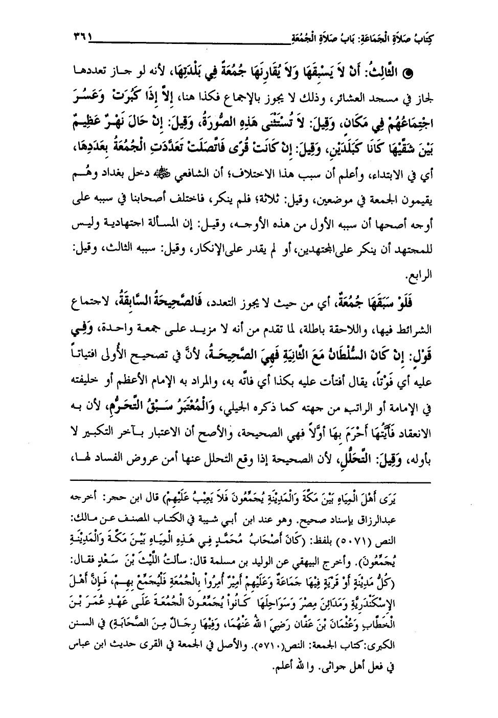 • الثَّالِثُ: أَنْ لاَ يَسْبِقَهَا وَلاَ يُقَارِنَهَا جُمُعَةً فِي بَلْدَتِهَا، لأنه لو جاز تعددها لجاز في مسجد العشائر، وذلك لا يجوز بالإجماع فكذا هنا، إِلَّا إِذَا كَبُرَتْ وَعَسُرَ اجْتِمَاعُهُمْ فِي مَكَانِ، وَقِيلَ: لاَ تُسْتَثْنَى هَذِهِ الصُّورَةُ، وَقِيلَ: إِنْ حَالَ نَهْرٌ عَظِيمٌ بَيْنَ شَقَّيْهَا كَانَا كَبَلَدَينِ، وَقِيلَ: إِنْ كَاَنَتْ قُرًى فَاتَّصَلَتْ تَعَدَّدَتِ الْجُمُعَةُ بِعَدَدِهَا، أى في الابتداء، وأعلم أن سبب هذا الاختلاف؛ أن الشافعي - رضي الله عنه - دخل بغداد وهُم يقيمون الجمعة في موضعين، وقيل: ثلاثة؛ فلم ينكر، فاختلف أصحابنا في سببه على