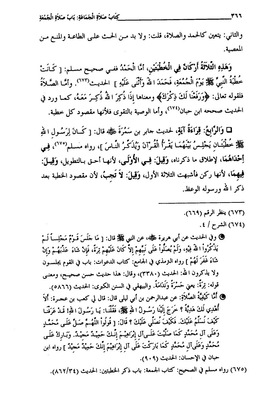 وَهَذِهِ الثَّلَاَثُةُ أَرْكَانٌ فِي الْخُطْبَتَيْنِ، أمَّا الْحَمْدُ ففي صحيح مسلم: [كَانَتْ خُطْبَةُ النَّبِيِّ - صلى الله عليه وسلم - يَوْمَ الْجُمُعَةِ، فَحَمَدَ الله وَأَثْنَى عَلَيْهِ] الحديث (¬673). وأمَّا الصَّلاَةُ فلقوله تعالى: {وَرَفَعْنَا لَكَ ذِكْرَكَ} ومعناها إِذَا ذُكِرَ اللهُ ذُكِرَ مَعَهُ، كما ورد في الحديث صححه ابن حبان (¬674)، وأما الوصية بالتقوى فلأنها مقصود كل خطبة.