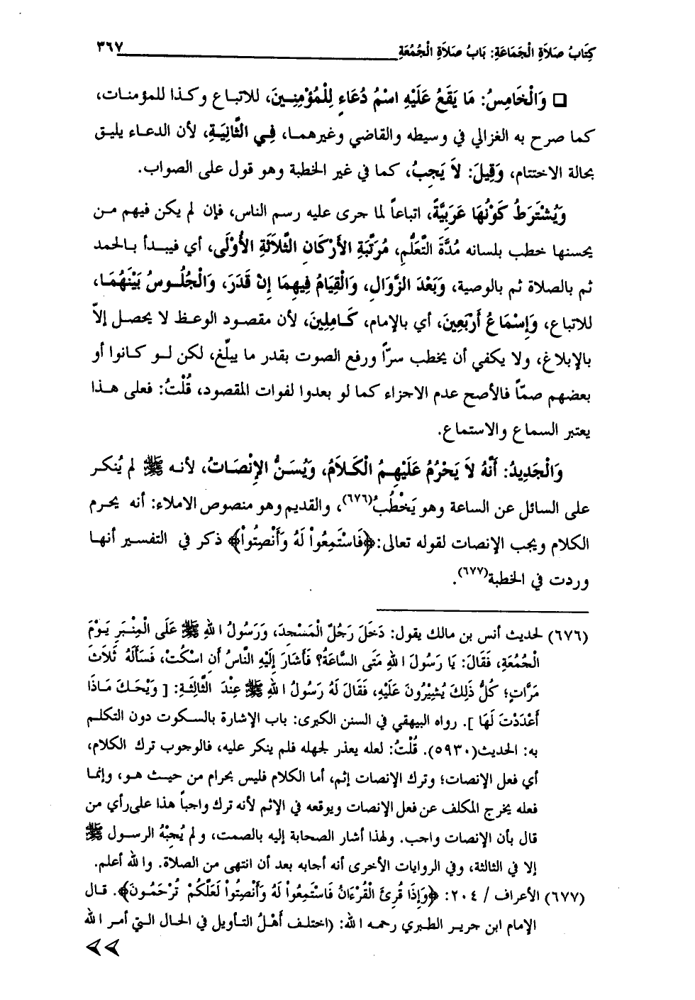 وَالْجَدِيدُ: أَنَّهُ لاَ يَحْرُمُ عَلَيْهِمُ الْكَلاَمُ، وَيُسَنُّ الإِنْصَاتُ، لأنه - صلى الله عليه وسلم - لم يُنكر على السائل عن الساعة وهو يَخْطُبُ (¬676)، والقديم وهو منصوص الاملاء: أنه يحرم الكلام ويجب الإنصات لقوله تعالى: {فَاسْتَمِعُوا لَهُ وَأَنْصِتُوا} ذكر في التفسير أنها وردت في الخطبة (¬677).