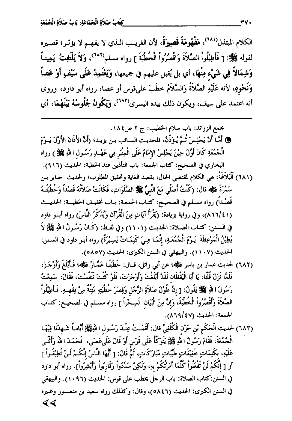(¬683) لحديث الْحَكَمِ بْنِ حَزْنٍ الْكُلَفِيِّ قال: أَقَمْتُ عِنْدَ رَسُولِ اللهِ - صلى الله عليه وسلم - أَيَّاماً شَهِدْنَا فِيْهَا الْجُمُعَةَ، فَقَامَ رَسُولُ اللهِ - صلى الله عليه وسلم - يَتَوَكَّأُ عَلَى قَوْسٍ أَوْ قَالَ عَلَى عَصَى، فَحَمَدَ الله وَأَثْنَى عَلَيْهِ، بكَلِمَاتٍ خَفِيْفَاتٍ طَيِّبَاتٍ مُبَارَكَاتٍ، ثُمَّ قَالَ: [أَيُّهَا النَّاسُ إِنَّكُمْ لَنْ تُطِيْقُواْ]
