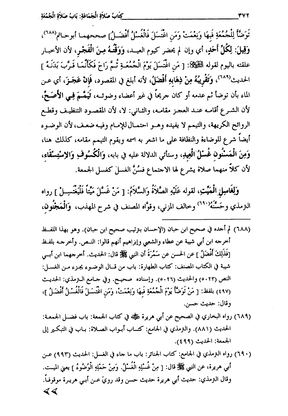 (¬688) لم أجده في صحيح ابن حبان (الإحسان بترتيب صحيح ابن حبان). وهو بهذا اللفظ أخرجه ابن أبي شيبة عن عطاء والشعبي وإبراهيم أنهم قالوا: النص. وأخرجه بلفظ [فَذَلِكَ أفْضَلُ] عن الحسن عن سَمُرَةَ أن النبي - صلى الله عليه وسلم - قال: الحديث. أخرجهما ابن أبي شيبة في الكتاب المصنف: كتاب الطهارة: باب من قال الوضوء يجزء من الغسل: النص (5023) والحديث (5026). وإسناده صحيح. وفي جامع الترمذي: الحديث (497) بلفظ: [مَنْ تَوَضَّأَ يَوْمَ الْجُمُعَةِ فَبِهَا وَنِعْمَتْ، وَمَنِ اغْتَسَلَ فَالغُسْلُ أفْضَلُ]، وقال: حديث حسن.