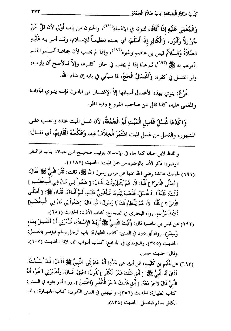 (¬692) عن قيس بن عاصم؛ قال: (أَتَيْتُ النَّبيَّ - صلى الله عليه وسلم - أُرِيْدُ الإِسْلاَمَ، فَأَمَرَنِي أَنْ أَغْتَسِلَ بِمَاءٍ وَسِدْرٍ). رواه أبو داود في السنن: كتاب الطهارة: باب الرجل يسلم فيؤمر بالغسل: