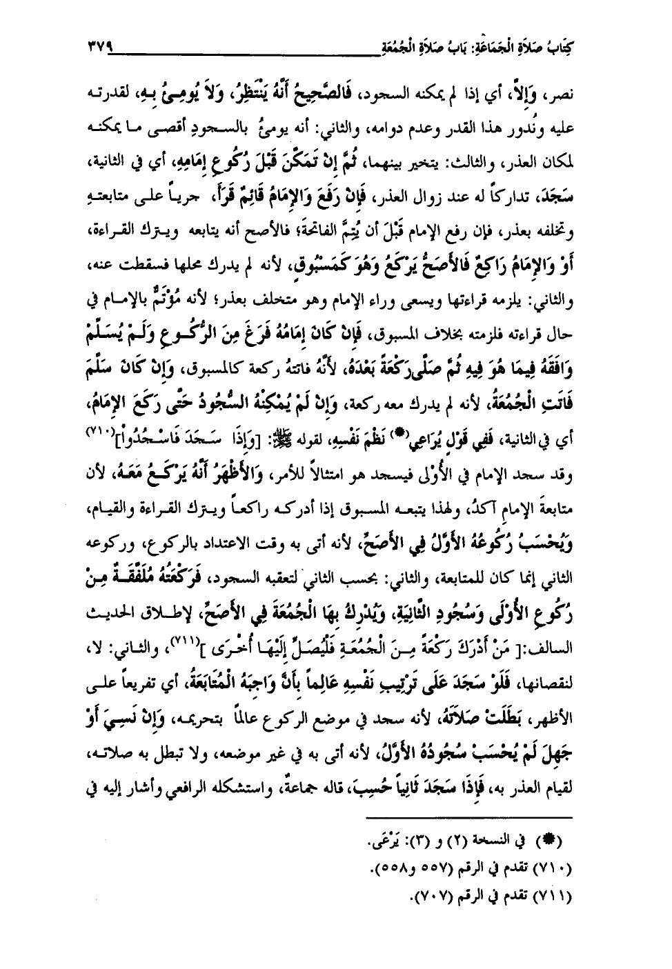 نصر، وَإِلَّا، أي إذا لم يمكنه السجود، فَالصَّحِيحُ أَنَّهُ يَنْتَظِرُ، وَلاَ يُومِئُ بِهِ، لقدرته عليه ونُدور هذا القدر وعدم دوامه، والثاني: أنه يومئُ بالسجودِ أقصى ما يمكنه لمكان العذر، والثالث: يتخير بينهما، ثُمَّ إِنْ تَمَكَّنَ قَبْلَ رُكُوعِ إِمَامِهِ، أي في الثانية، سَجَدَ، تداركاً له عند زوال العذر، فَإِنْ رَفَعَ وَالإِمَامُ قَائِمٌ قَرَأَ، جرياً على متابعتهِ وتخلفه بعذر، فإن رفع الإمام قَبْلَ أن يُتِمَّ الفاتحةَ؛ فالأصح أنه يتابعه ويترك القراءة، أَوْ وَالإِمَامُ رَاكِعٌ فَالأَصَحُّ يَرْكَعُ وَهُوَ كَمَسْبُوقٍ، لأنه لم يدرك محلها فسقطت عنه، والثاني: يلزمه قراءتها ويسعى وراء الإمام وهو متخلف بعذر؛ لأنه مُؤْتَمُّ بالإمام في حال قراءته فلزمته بخلاف المسبوق، فَإِنْ كَانَ إِمَامُهُ فَرَغَ مِنَ الرُّكُوعِ وَلَمْ يُسَلِّمْ وَافَقَهُ فِيمَا هُوَ فِيهِ ثُمَّ صَلَّى رَكْعَةً بَعْدَهُ، لأَنَّهُ فاتتهُ ركعة كالمسبوق، وَإِنْ كَانَ سَلَّمَ فَاتَتِ الْجُمُعَةُ، لأنه لم يدرك معه ركعة، وَإِنْ لَمْ يُمْكِنْهُ السُّجُودُ حَتَّى رَكَعَ الإِمَامُ، أي في الثانية، فَفِي قَوْلٍ يُرَاعِي نَظْمَ نَفْسِهِ، لقوله - صلى الله عليه وسلم -: [وَإِذَا سَجَدَ فَاسْجُدُواْ] (¬710) وقد سجد الإمام في الأُوْلى فيسجد هو امتثالاً للأمر، وَالأَظْهَرُ أَنَّهُ يَرْكَعُ مَعَهُ، لأن متابعةَ الإمامِ آكدُ، ولهذا يتبعه المسبوق إذا أدركه راكعاً ويترك القراءة والقيام، وُيحْسَبُ رُكُوعُهُ الأَوَّلُ فِي الأَصَحِّ، لأنه أتى به وقت الاعتداد بالركوع، وركوعه الثاني إنما كان للمتابعة، والثاني: بحسب الثاني لتعقبه السجود، فَرَكْعَتُهُ مُلَفَّقَةٌ مِنْ رُكُوعِ الأُوْلَى وَسُجُودِ الثَّانِيَةِ، وَيُدْرِكُ بِهَا الْجُمُعَةَ فِي الأَصَحِّ، لإطلاق الحديث السالف: [مَنْ أَدْرَكَ رَكْعَةً مِنَ الْجُمُعَةِ فَلْيُصَلِّ إِلَيْهَا أُخْرَى] (¬711)، والثاني: لا، لنقصانها، فَلَوْ سَجَدَ عَلَى تَرْتِيبِ نَفْسِهِ عَالِماً بِأَنَّ وَاجِبَهُ الْمُتَابَعَةُ، أى تفريعاً على