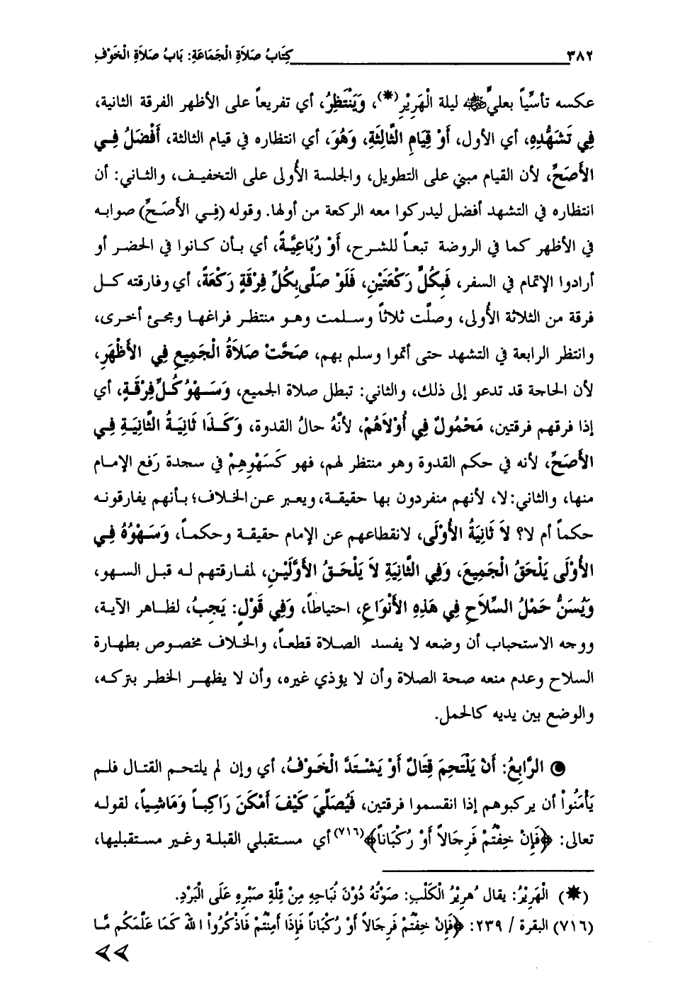 • الرَّابِعُ: أَنْ يَلْتَحِمَ قِتَالٌ أَوْ يَشْتَدَّ الْخَوْفُ، أى وإن لم يلتحم القتال فلم يَأْمَنُواْ أن يركبوهم إذا انقسموا فرقتين، فَيُصَلِّيَ كَيْفَ أَمْكَنَ رَاكِباً وَمَاشِياً، لقوله تعالى: {فَإِنْ خِفْتُمْ فَرِجَالًا أَوْ رُكْبَانًا} (¬716) أي مستقبلي القبلة وغير مستقبليها،