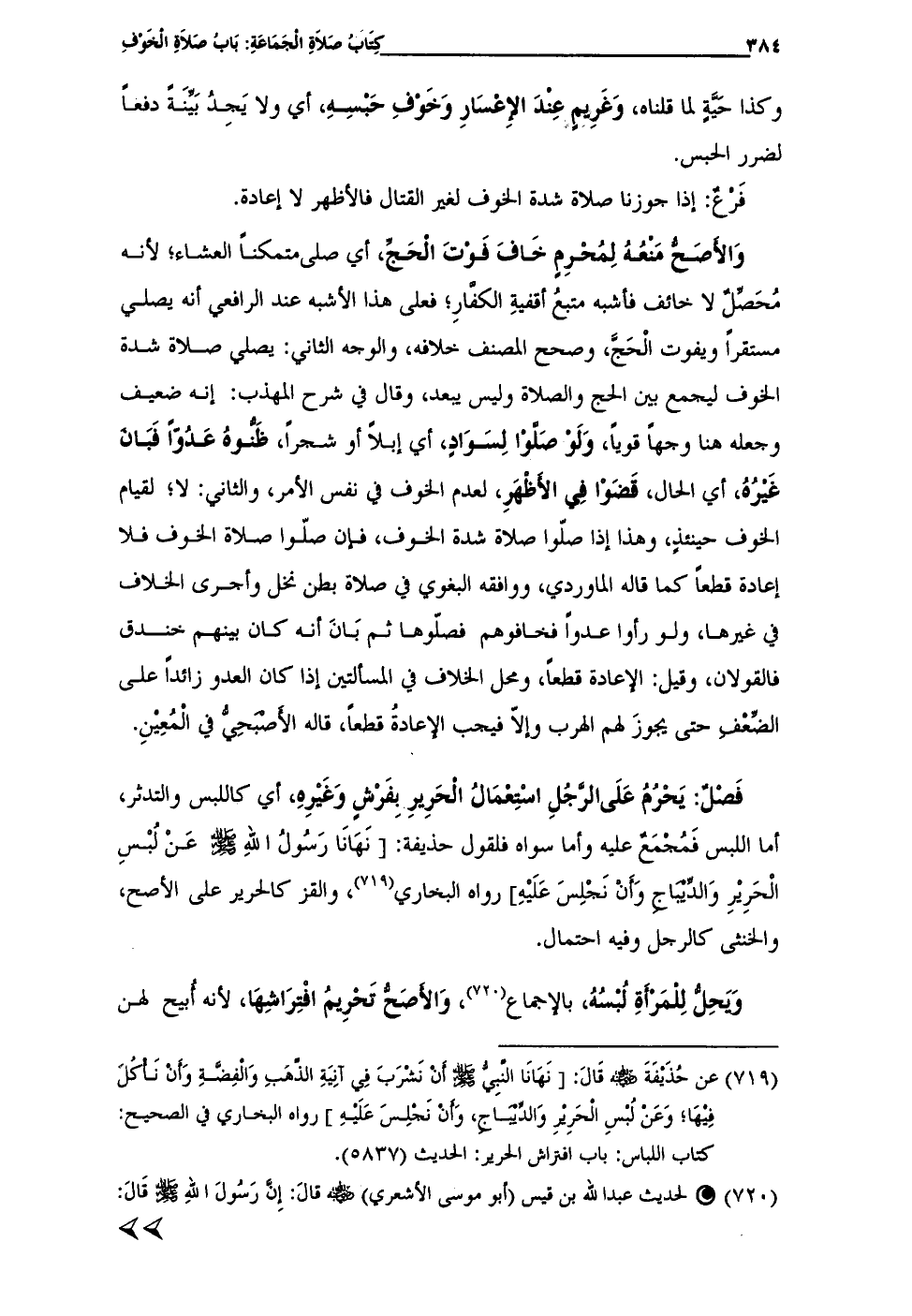 وَالأَصَحُّ مَنْعُهُ لِمُحْرِمٍ خَافَ فَوْتَ الْحَجِّ، أي صلى متمكناً العشاء؛ لأنه مُحَصِّلٌ لا خائف فأشبه متبعُ أقفيةِ الكفَّارِ؛ فعلى هذا الأشبه عند الرافعي أنه يصلي مستقراً ويفوت الْحَجَّ، وصحح المصنف خلافه، والوجه الثاني: يصلي صلاة شدة الخوف ليجمع بين الحج والصلاة وليس يبعد، وقال في شرح المهذب: إنه ضعيف وجعله هنا وجهاً قوياً، وَلَوْ صَلَّوْا لِسَوَادٍ، أي إبلاً أو شجراً، ظَنُّوهُ عَدُوّاً فَبَانَ