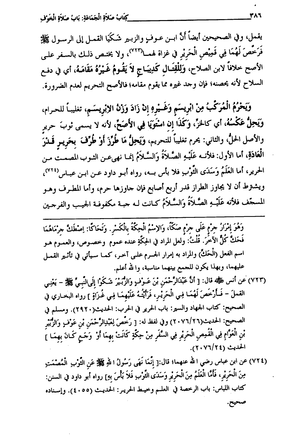 (¬724) عن ابن عباس رضي الله عنهما؛ قال: [إِنَّمَا نَهَى رَسُولُ اللهِ - صلى الله عليه وسلم - عَنِ الثَّوْبِ الْمُصْمَتِ مِنَ الْحَرِيْرِ، فَأَمَّا الْعَلَمُ مِنَ الْحَرِيْرِ وَسَدَى الثَّوْبِ فَلاَ بَأْسَ بِهِ] رواه أبو داود في السنن: كتاب اللباس: باب الرخصة في العلم وخيط الحرير: الحديث (4055). وإسناده صحيح.