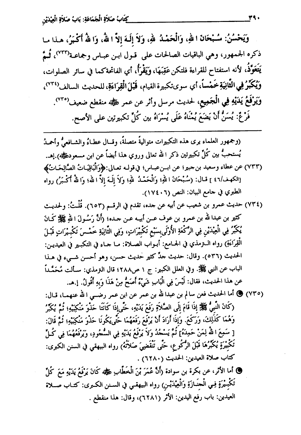 تَكْبِيْرَةٍ فِي الْجِنَازَةِ وَالْعِيْدَيْنِ) رواه البيهقي في السنن الكبرى: كتاب صلاة العيدين: باب رفع اليدين: الأثر (6281)، وقال: هذا منقطع.