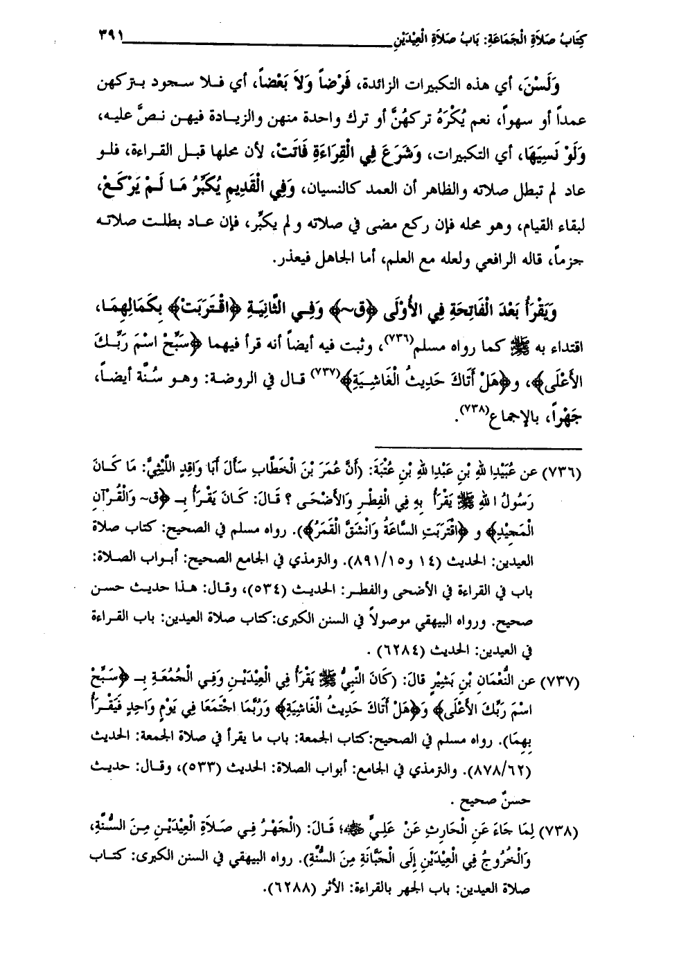 (¬737) عن النُّعْمَانِ بْنِ بَشِيْرٍ قالَ: (كَانَ النَّبِيُّ - صلى الله عليه وسلم - يَقْرَأُ فِي الْعِيْدَيْنِ وَفِي الْجُمْعَةِ بـ {سَبِّحِ اسْمَ رَبِّكَ الْأَعْلَى} وَ {هَلْ أَتَاكَ حَدِيثُ الْغَاشِيَةِ} وَرُبَّمَا اجْتَمَعَا فِي يَوْمٍ وَاحِدٍ فَيَقْرَأُ