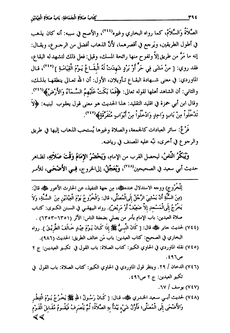(¬744) لحديث جابر - رضي الله عنه - قال: [كَانَ النَّبِيُّ - صلى الله عليه وسلم - إِذَا كَانَ يَوْمَ عِيْدٍ خَالَفَ الطَّرِيْقَ]. رواه البخاري في الصحيح: كتاب العيدين: باب من خالف الطريق: الحديث (986).