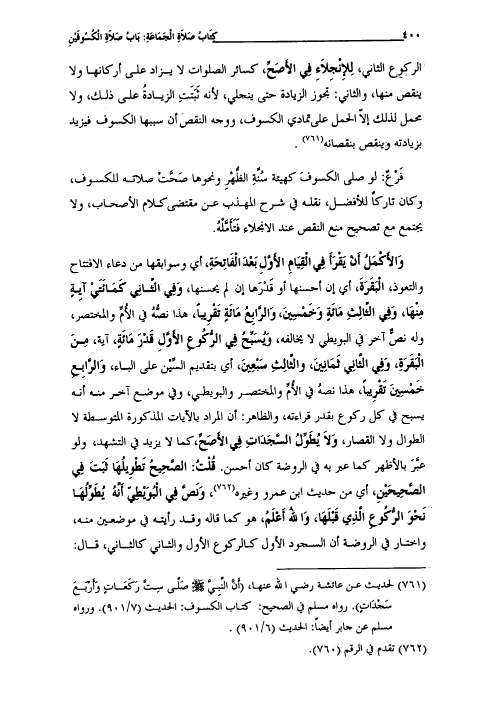 (¬761) لحديث عن عائشة رضى الله عنها، (أَنَّ النَّبِيَّ - صلى الله عليه وسلم - صَلِّى سِتَّ رَكَعَاتٍ وَأَرْبَعَ سَجْدَاتٍ). رواه مسلم في الصحيح: كتاب الكسوف: الحديث (7/ 901). ورواه مسلم عن جابر أيضًا: الحديث (6/ 901).