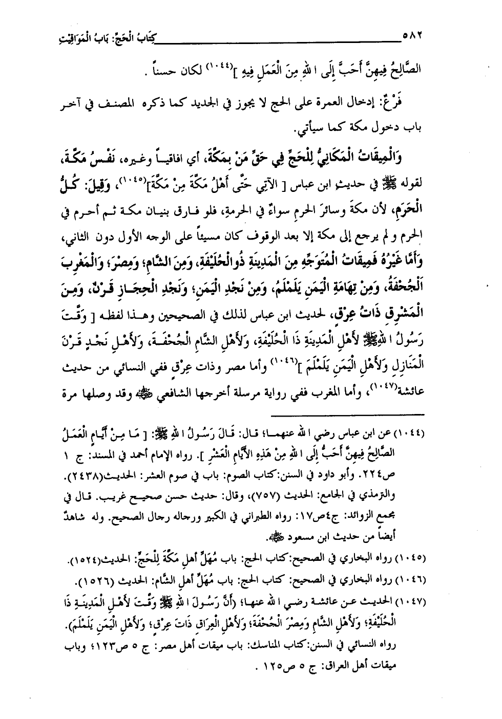 (¬1047) الحديث عن عائشة رضى الله عنها؛ (أنَّ رَسُولَ اللهِ - صلى الله عليه وسلم - وَقتَ لأهْلِ المَدِينَةِ ذَا الحُلَيفَهِ؛ وَلأهْلِ الشَّامِ وَمِصرَ الجُحفَةَ؛ وَلأهلِ العِرَاقِ ذَات عِرْقٍ؛ وَلأهْلِ اليَمَنِ يَلملَمَ). رواه النسائي في السنن: كتاب المناسك: باب ميقات أهل مصر: ج 5 ص 123؛ وباب ميقات أهل العراق: ج 5 ص 125.