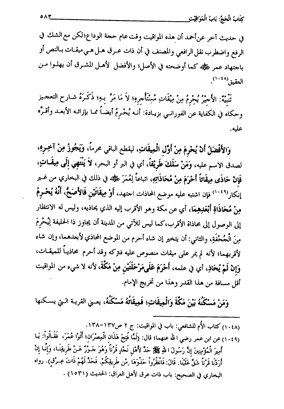 (¬1049) عن ابن عمر رضي الله عنهما؛ قال: (لَمَّا فُتِحَ هَذَانِ المِصْرَان؛ أتَوْا عُمَرَ، فَقَالُوا: يَا أميرَ المُؤمِنِينَ إِنْ رَسُولَ اللهِ - صلى الله عليه وسلم - حَدَّ لأهلِ نَجد قَرنا وَهُوَ جَورٌ عَنْ طَرِيقِنَا، وَإِنا إِن أرَدنَا قَرْنًا شَق عَلَينَا. قَالَ: فَانظُرُوا حَذوَهاِ مْن طَرِيقِكُم. فَحَدَّ لَهُم ذَاتَ عِرْقٍ). رواه البخارى في الصحيح: باب ذات عرق لأهل العراق: الحديث (1531).