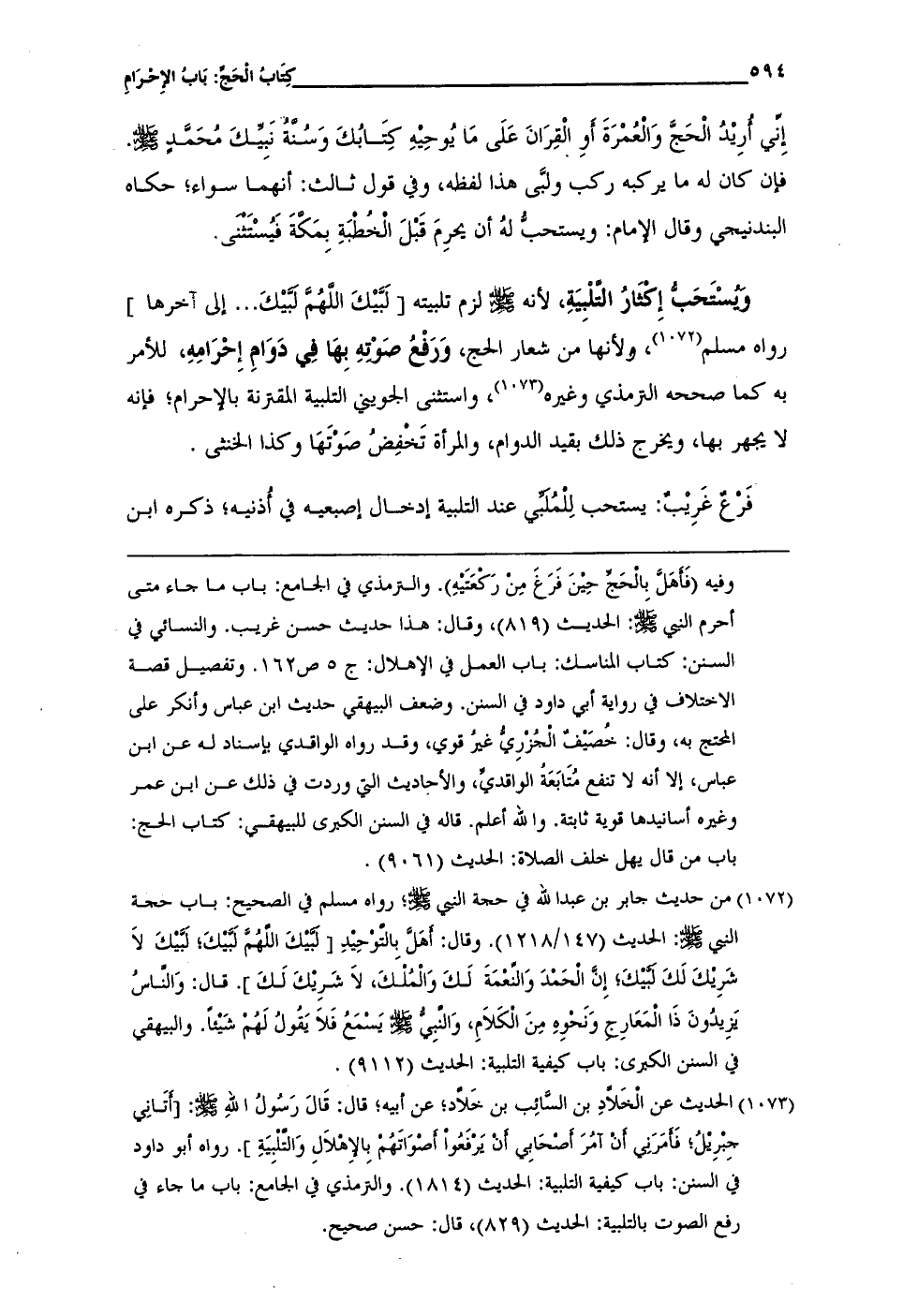 (¬1072) من حديث جابر بن عبد الله في حجة النبي - صلى الله عليه وسلم -؛ رواه مسلم في الصحيح: باب حجة النبي - صلى الله عليه وسلم -: الحديث (147/ 1218). وقال: أهَلَّ بِالتَّوْحِيْدِ [لَبَّيْكَ اللَّهُمَّ لَبَّيْكَ؛ لَبَّيْكَ لَا شَرِيْكَ لَكَ لَبَّيْكَ؛ إِنَّ الْحَمْدَ وَالنَّعْمَةَ لَكَ وَالْمُلْكَ، لَا شَرِيْكَ لَكَ]. قال: وَالنَّاسُ يَزِيدُونَ ذَا الْمَعَارِج وَنَحْوِهِ مِنَ الْكَلَامِ، وَالنَّبِيُّ - صلى الله عليه وسلم - يَسْمَعُ فَلَا يَقُولُ لَهُمْ شَيْئًا. والبيهقي في السنن الكبرى: باب كيفية التلبية: الحديث (9112).