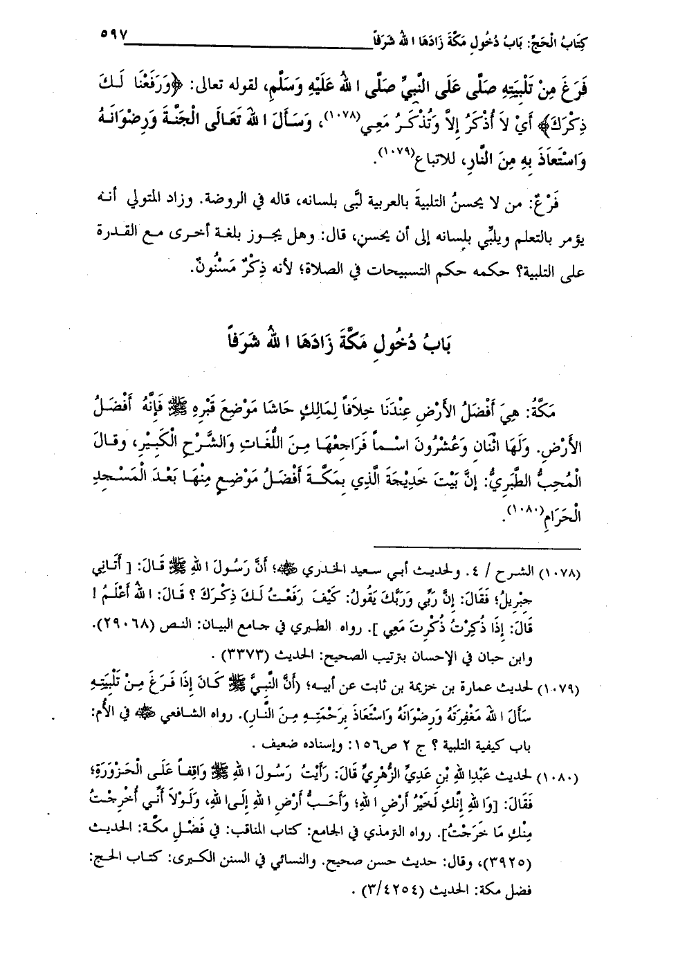 (¬1079) لحديث عمارة بن خزيمة بن ثابت عن أبيه؛ (أَنَّ النَّبيَّ - صلى الله عليه وسلم - كَانَ إِذَا فَرَغَ مِنْ تَلْبيَتِهِ سَأَلَ الله مَغْفِرَتَهُ وَرِضْوَانَهُ وَاسْتَعَاذَ بِرَحْمَتِهِ مِنَ النَّارِ). رواه الشافعي - رضي الله عنه - في الأُم: باب كيفية التلبية؟ ج 2 ص 156: وإسناده ضعيف.