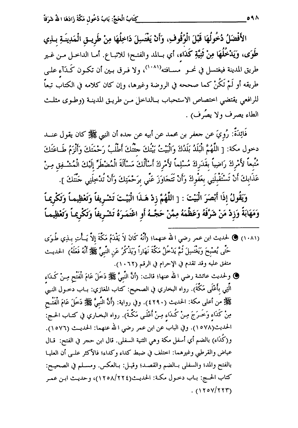 (¬1081) • لحديث ابن عمر رضى الله عنهما؛ (أنَّهُ كَانَ لَا يَقْدَمُ مَكَّةَ إِلَّا يَأْتِ بِذِي طُوَى حَتَّى يُصْبِحَ وَيَغْتَسِلَ ثُمَّ يَدْخُلُ مَكَّةَ نَهَارًا وَيَذْكُرُ عَنِ النَّبِيِّ - صلى الله عليه وسلم - أنَّهُ فَعَلَهُ) الحديث متفق عليه وقد تقدم في الإحرام فى الرقم (1062).