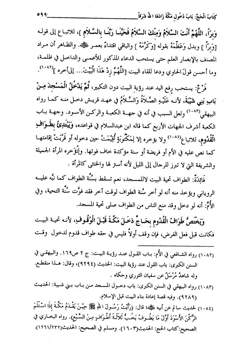 (¬1084) لحديث سالم عن أبيه - رضي الله عنه -؛ قال: (رَأَيْتُ رَسُولَ اللهِ - صلى الله عليه وسلم - حِيْنَ يَقدَمُ مَكَّةَ إِذَا اسْتَلَمَ الرُّكْنَ الأَسْوَدَ أوَّلَ مَا يَطُوفُ يَخُبُّ ثَلَاثَةَ أَطْوَافٍ مِنَ السَّبْعِ). رواه البخاري في الصحيح: كتاب الحج: الحديث (1603). ومسلم في الصحيح: الحديث (232/ 1261).