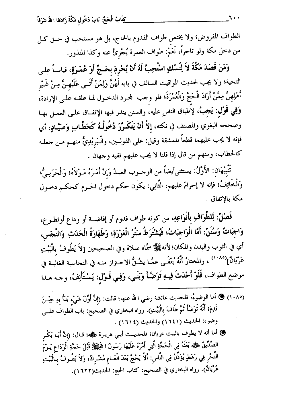(¬1085) • أما الوضوءُ؛ فلحديث عائشة رضى الله عنها؛ قالت: (إِنَّ أَوَّلَ شَيْءٍ بَدَأَ بِهِ حِيْنَ قَدِمَ؛ أَنَّهُ تَوَضَّأ ثُمَّ طَافَ بِالْبَيْتِ). رواه البخاري في الصحيح: باب الطَّواف على وضوء: الحديث (1641) والحديث (1614).